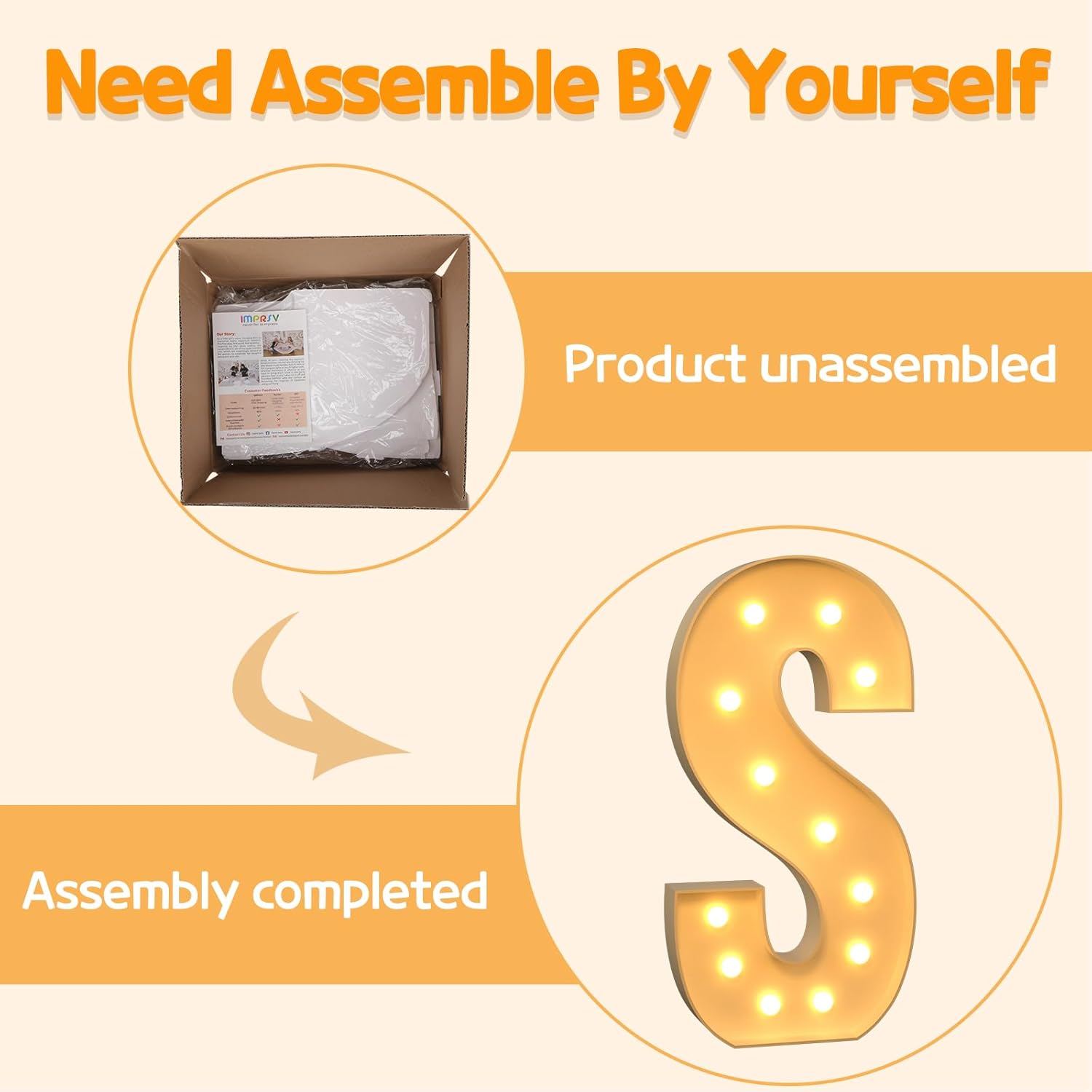• Assembly Required: Our large marquee letters is made from foam board and easy to assemble with our splicing mode. Just follow the numbered instructions to align and insert the bottom plate, and reinforce it with a hot glue gun. Then, you're done!
