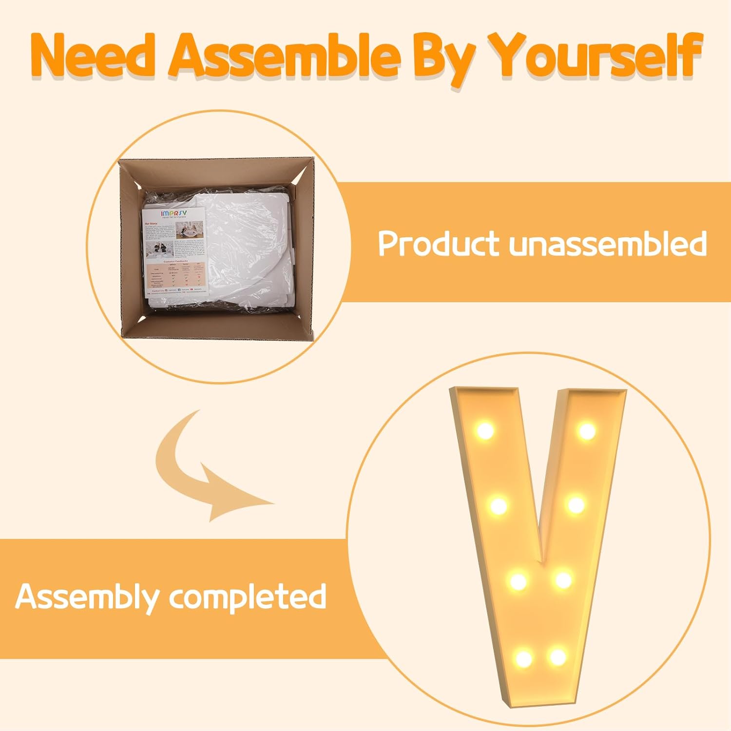 • Assembly Required: Our large marquee letters is made from foam board and easy to assemble with our splicing mode. Just follow the numbered instructions to align and insert the bottom plate, and reinforce it with a hot glue gun. Then, you're done!