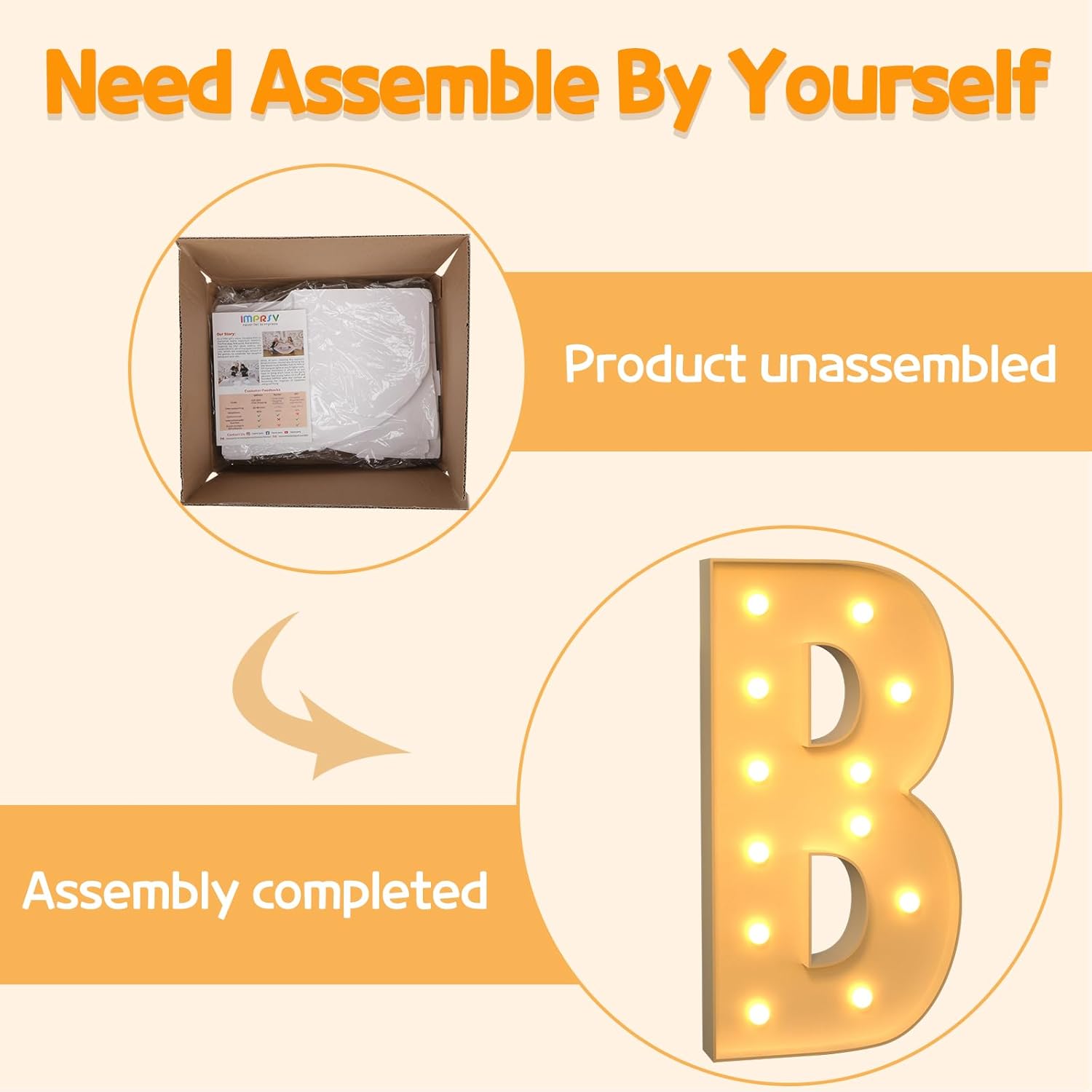 • Assembly Required: Our large marquee letters is made from foam board and easy to assemble with our splicing mode. Just follow the numbered instructions to align and insert the bottom plate, and reinforce it with a hot glue gun. Then, you're done!