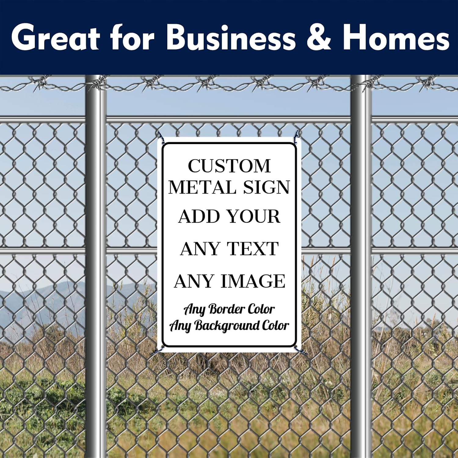 • 12 x 8 inch aluminum custom metal sign with 4 pre-drilled holes on the side that can be easily attached to any surface such as walls, doors or fences with cable ties or screws.