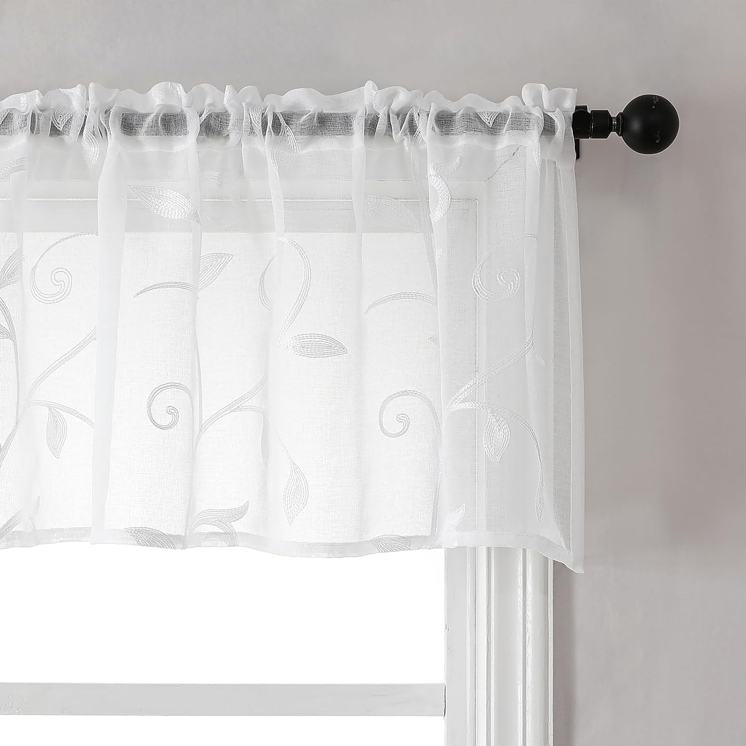VISIONTEX Sheer Voile Curtain Valances, Decorative Leaves Embroidered, Rod Pocket Window Treatment for Kitchen/Rustic Bedroom/Living Room (54 x 16 Inch,1 Panel)