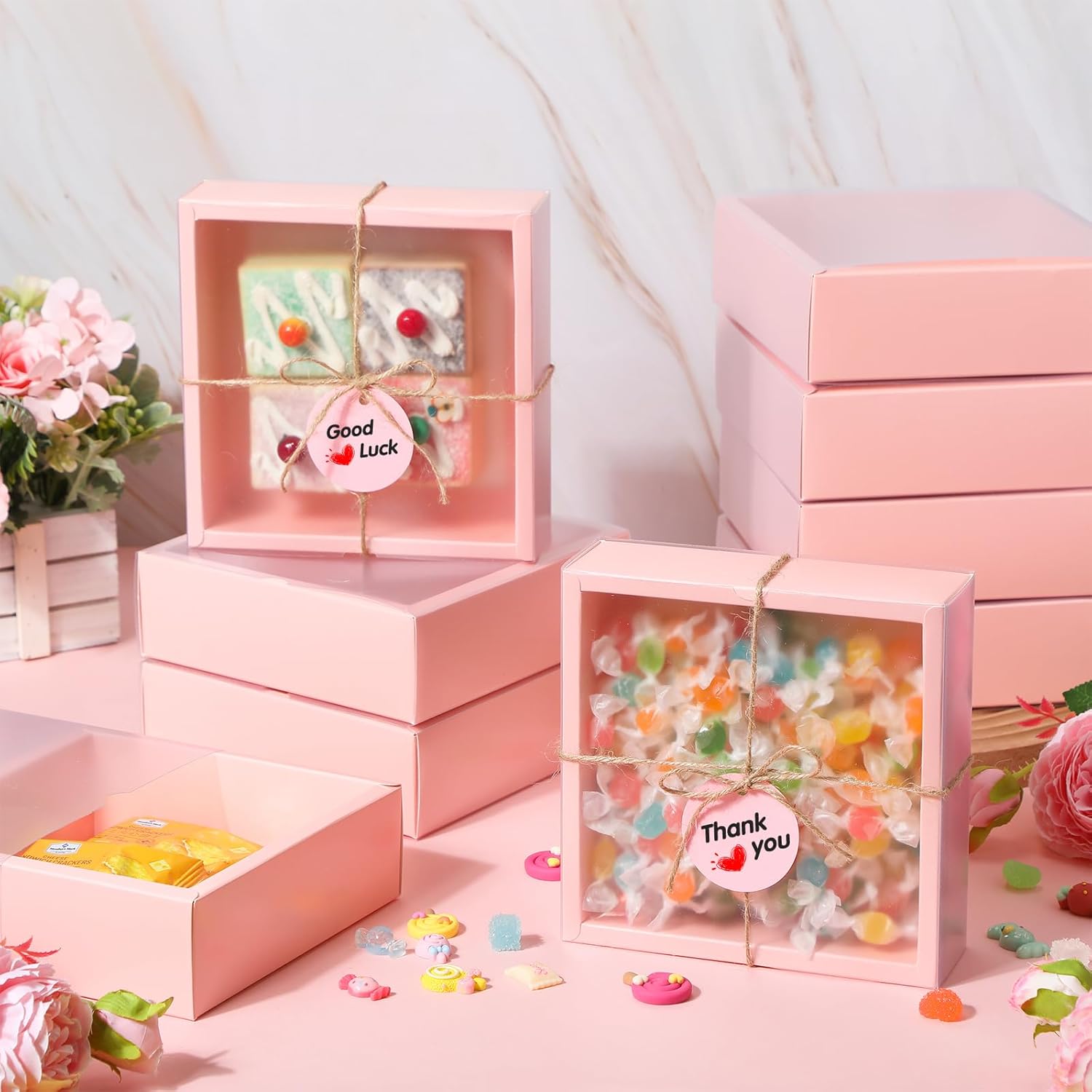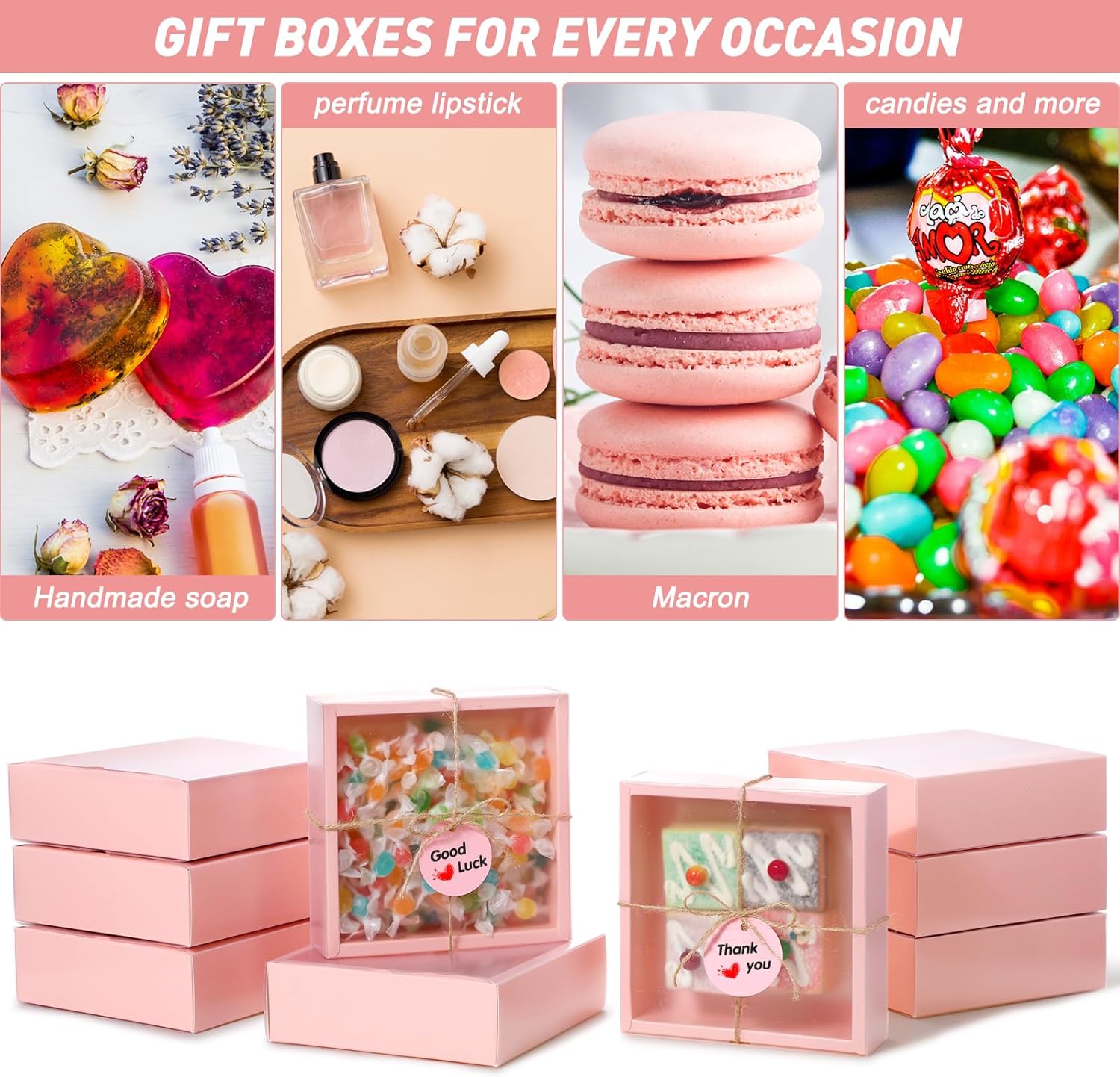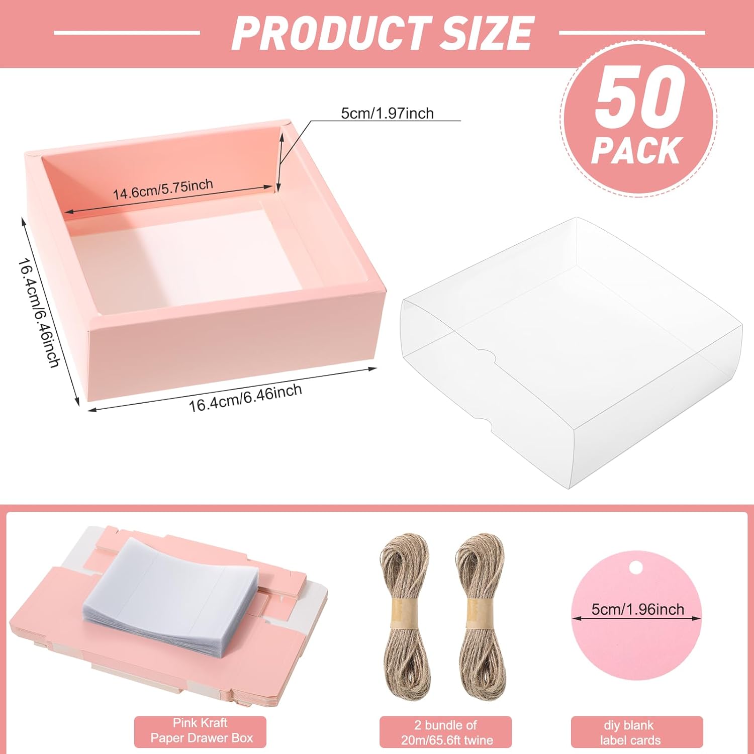Roowest 50 Sets Kraft Soap Boxes Rectangle Packaging Box with Window Homemade Gift Box with Blank Tags and Jute String for Jewelry Candy Wrapping Party Favor(6.5 x 6.5 x 2 Inch,Pink)