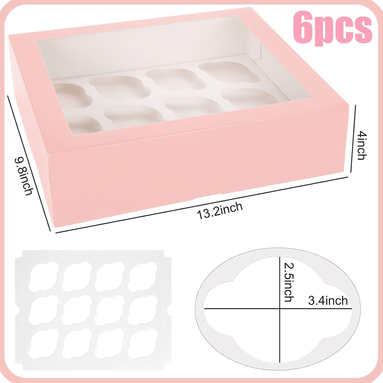 VGOODALL 12 Count Cupcake Boxes, 6PCS 13.2x9.8x4Inches Pink Cupcake Container with Window Boxes Holding 72 Pastry Box for Birthday Holiday Party Bakery Supplies