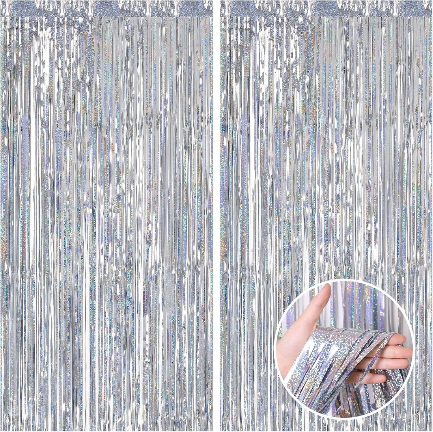 • 🎉PACKAGE INCLUDED : 2 pack of silver foil fringe curtains, the size of each tinsel curtain is 3.3 ft x 8.2 ft, enough length for hanging on a door or covering a wall fully, suitable for any parties.