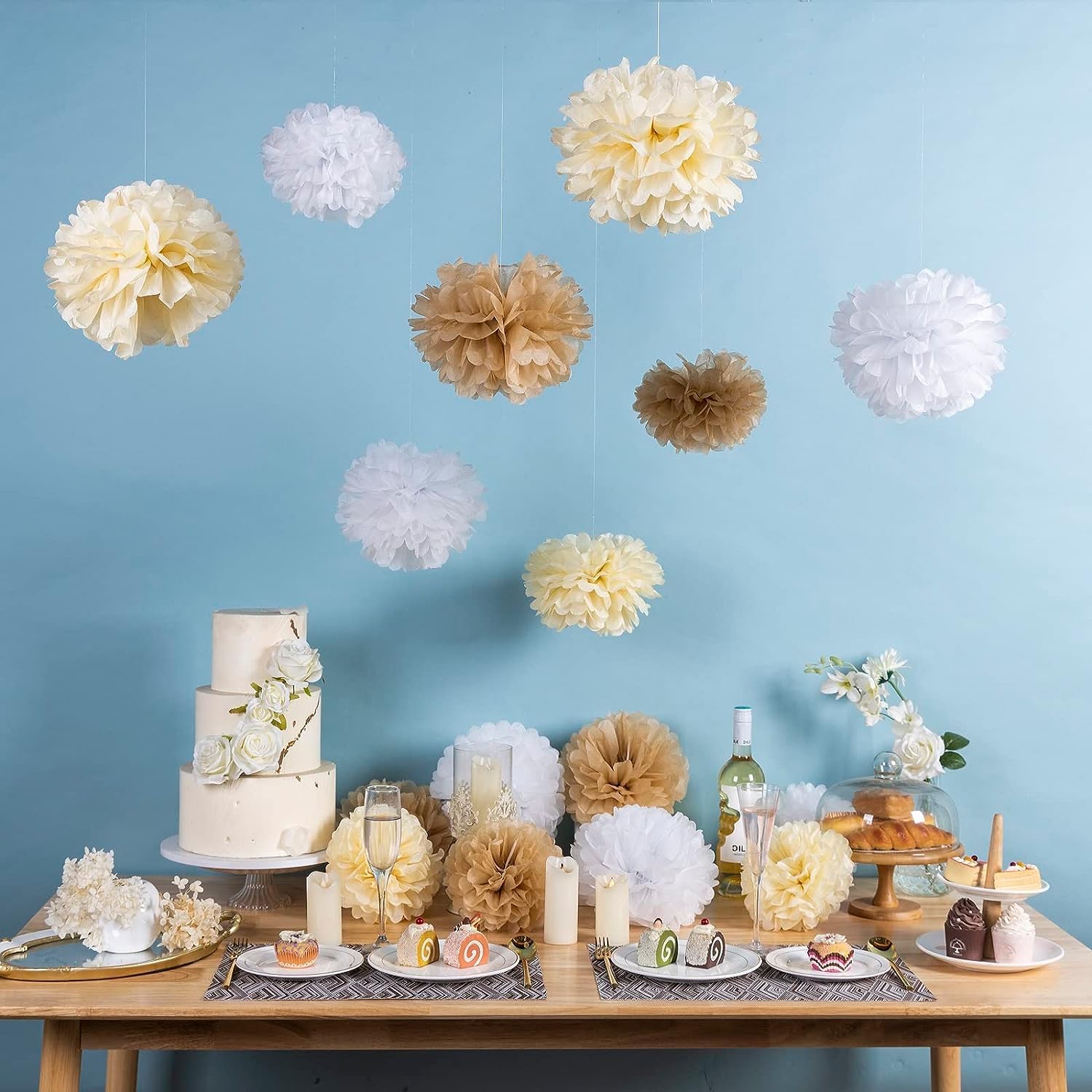 • Perfect for Any Occasion:Whether it's a wedding, birthday, engagement reception, or bridal shower, these pom-poms elevate your decor with understated elegance. Their boho flair suits rustic, vintage, or modern themes, while the gender-neutral tones work for baby showers and boots-or-bows gender reveals. Use them as backdrops, centerpieces, or ceiling accents—they transform spaces instantly.