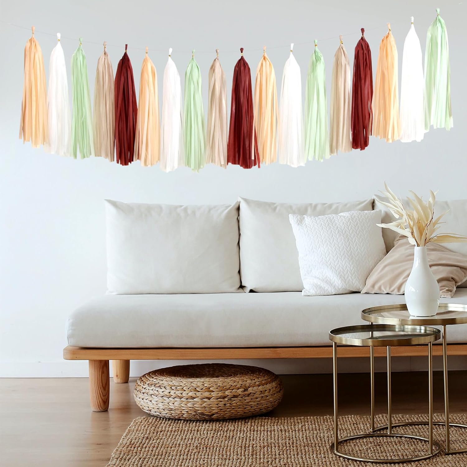• 【Garland includes】25tassels,5pcs sage green tassel garland, 5pcs white tassel garlands, 5pcs champagne garlands,5pcs burgundy garlands. Each tassel is about 14" long after assembled. And each garland comes with a 10ft long free String for hanging these tassels.