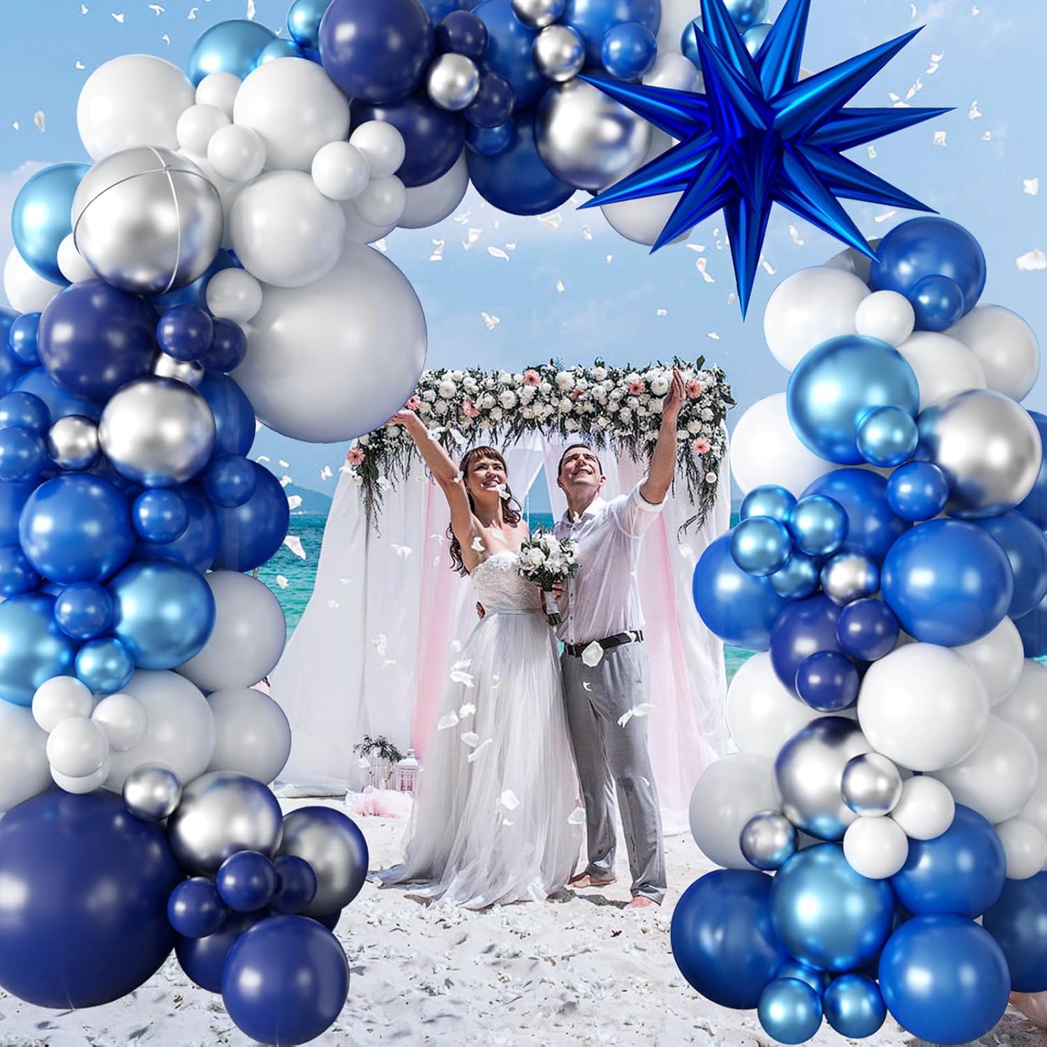 • 🎈What You Get - Blue Silver White Balloon Garland Arch Kit, package including 1pc blue explosion star foil balloon, 1pc 10 inches silver 4D round foil balloon, 2pcs 18 inches balloons(white*1, retro navy blue*1), 48pcs 10 inches balloons(pearl dark blue*20, matte white*10, metallic blue*6, retro navy blue*6, metallic silver*6), 40pcs 5 inches balloons(pearl dark blue*8, matte white*8, metallic blue*8, retro navy blue*8, metallic silver*8), 1pc balloon strip, 1pc dot glue. All in one package!
