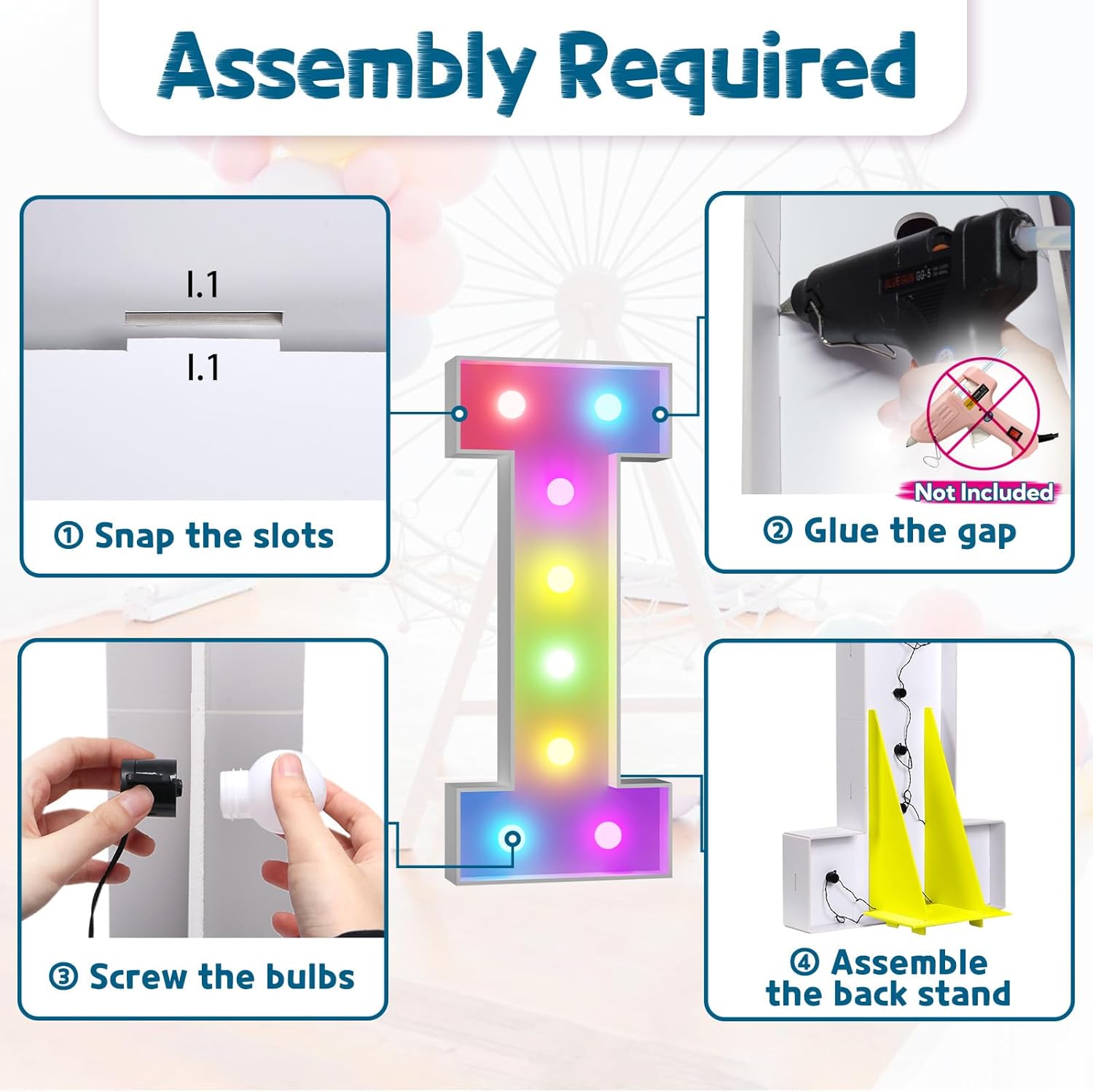 • Assembly Required. To assemble the light up numbers and letters, a hot glue gun is necessary. We have conveniently pre-cut the numbers into several pieces for your convenience. Simply consult the included instruction manual to easily assemble the impressive 4 ft tall and 3ft tall marquee numbers and letters using a hot glue gun.