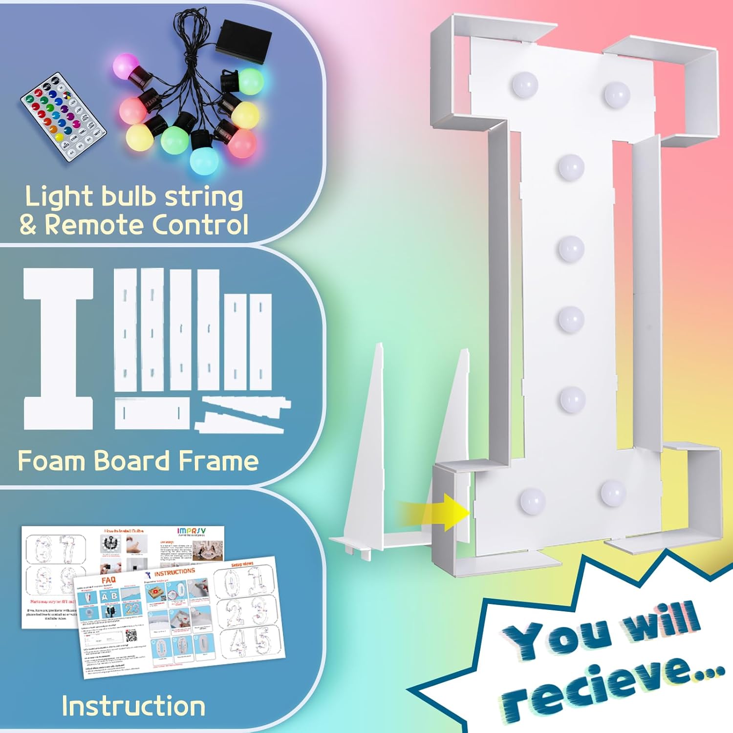 imprsv 3FT Colorful Marquee Light Up Letters I, 18 Colors Large Light up Letters Alphabet Sign with Remote, Big Marry Me Sign, Birthday Party Decorations Baby Shower Anniversary Wedding Decoration