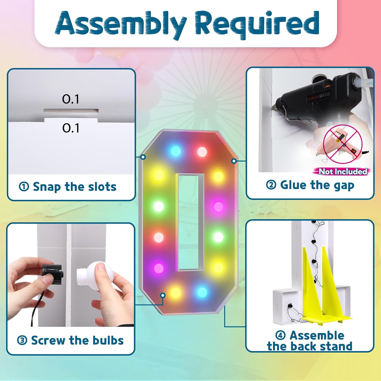 • Assembly Required. To assemble the light up numbers and letters, a hot glue gun is necessary. We have conveniently pre-cut the numbers into several pieces for your convenience. Simply consult the included instruction manual to easily assemble the impressive 4 ft tall and 3ft tall marquee numbers and letters using a hot glue gun.