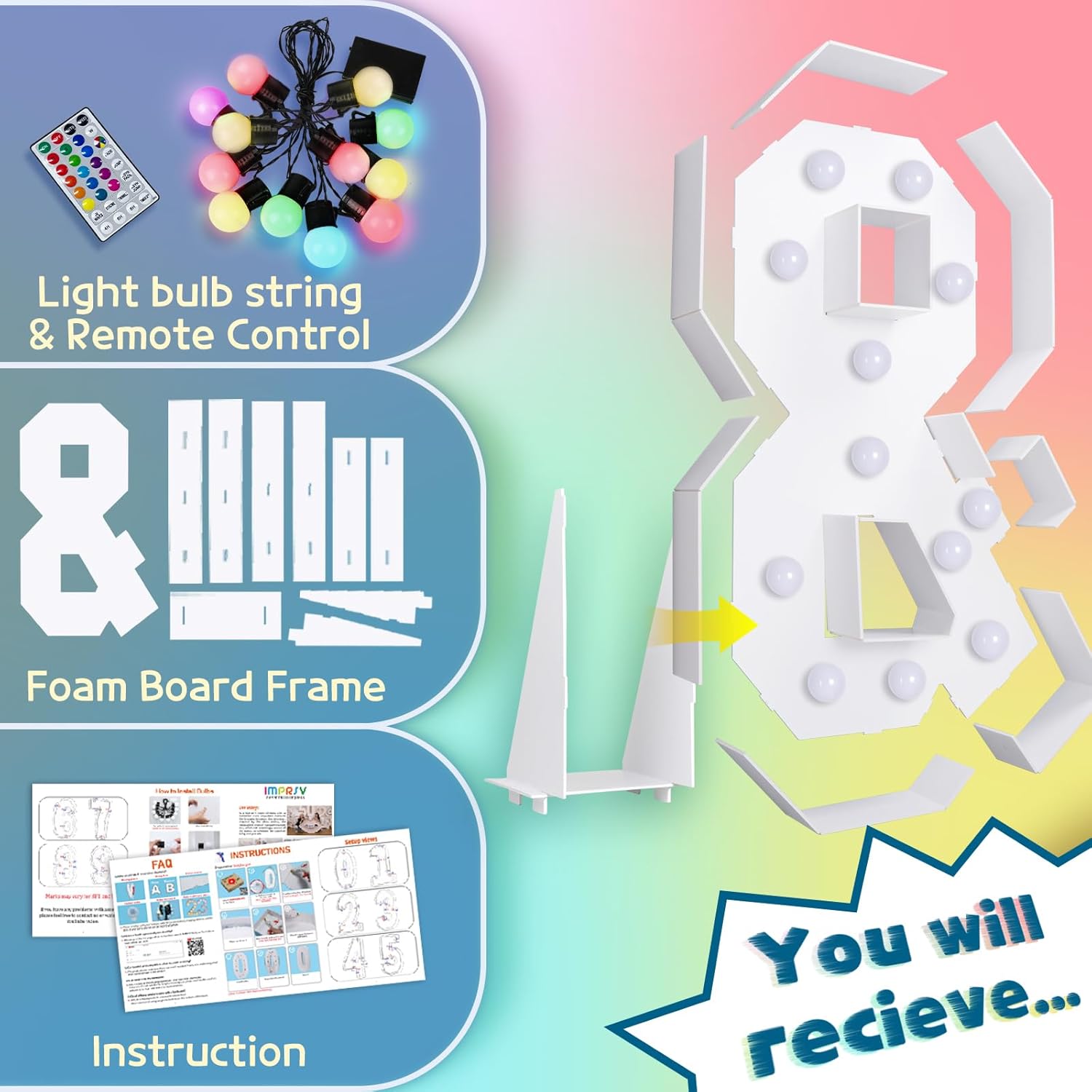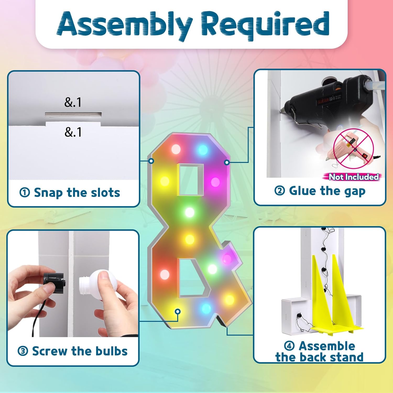 • Assembly Required. To assemble the light up numbers and letters, a hot glue gun is necessary. We have conveniently pre-cut the numbers into several pieces for your convenience. Simply consult the included instruction manual to easily assemble the impressive 4 ft tall and 3ft tall marquee numbers and letters using a hot glue gun.
