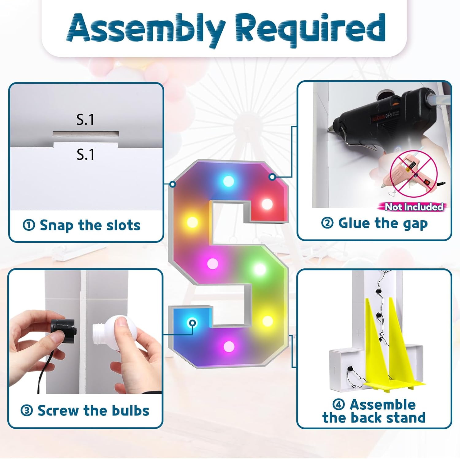 • Assembly Required. To assemble the light up numbers and letters, a hot glue gun is necessary. We have conveniently pre-cut the numbers into several pieces for your convenience. Simply consult the included instruction manual to easily assemble the impressive 4 ft tall and 3ft tall marquee numbers and letters using a hot glue gun.