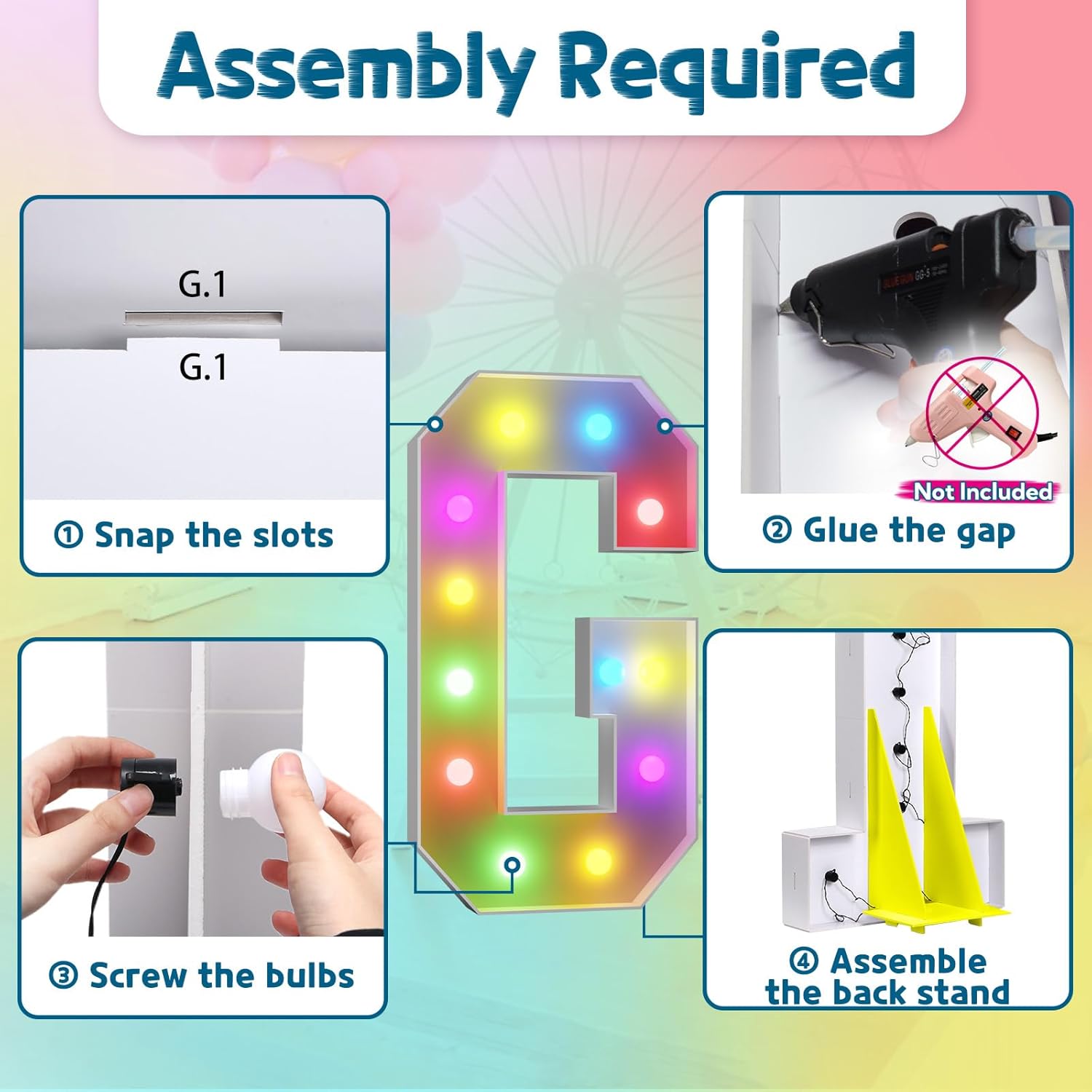 • Assembly Required. To assemble the light up numbers and letters, a hot glue gun is necessary. We have conveniently pre-cut the numbers into several pieces for your convenience. Simply consult the included instruction manual to easily assemble the impressive 4 ft tall and 3ft tall marquee numbers and letters using a hot glue gun.