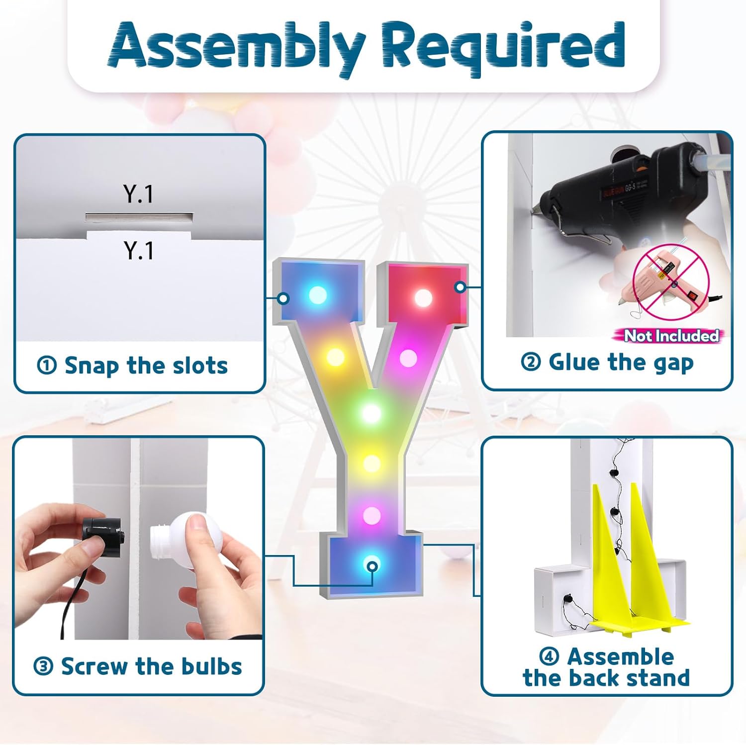 • Assembly Required. To assemble the light up numbers and letters, a hot glue gun is necessary. We have conveniently pre-cut the numbers into several pieces for your convenience. Simply consult the included instruction manual to easily assemble the impressive 4 ft tall and 3ft tall marquee numbers and letters using a hot glue gun.
