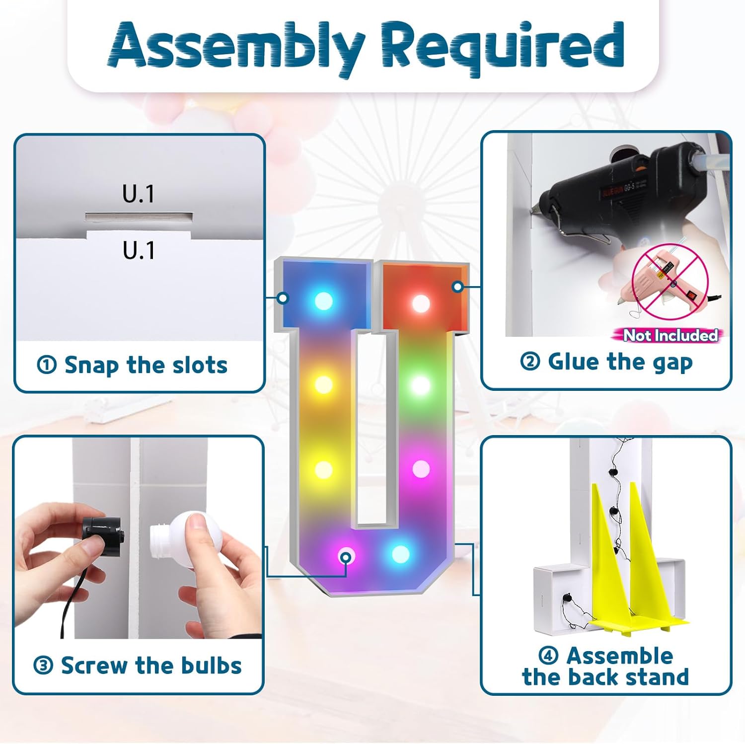 • Assembly Required. To assemble the light up numbers and letters, a hot glue gun is necessary. We have conveniently pre-cut the numbers into several pieces for your convenience. Simply consult the included instruction manual to easily assemble the impressive 4 ft tall and 3ft tall marquee numbers and letters using a hot glue gun.