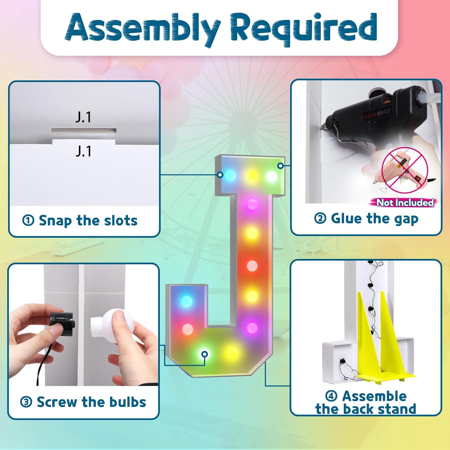 • Assembly Required. To assemble the light up numbers and letters, a hot glue gun is necessary. We have conveniently pre-cut the numbers into several pieces for your convenience. Simply consult the included instruction manual to easily assemble the impressive 4 ft tall and 3ft tall marquee numbers and letters using a hot glue gun.