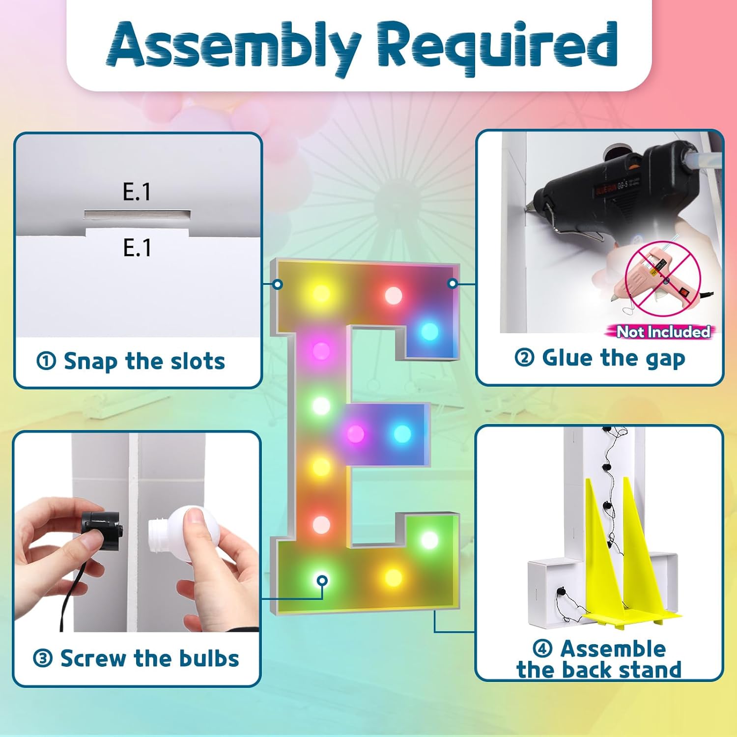 • Assembly Required. To assemble the light up numbers and letters, a hot glue gun is necessary. We have conveniently pre-cut the numbers into several pieces for your convenience. Simply consult the included instruction manual to easily assemble the impressive 4 ft tall and 3ft tall marquee numbers and letters using a hot glue gun.