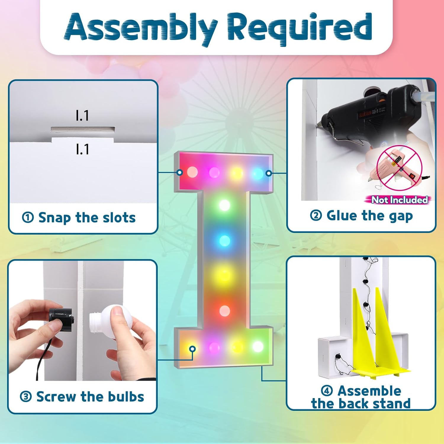 • Assembly Required. To assemble the light up numbers and letters, a hot glue gun is necessary. We have conveniently pre-cut the numbers into several pieces for your convenience. Simply consult the included instruction manual to easily assemble the impressive 4 ft tall and 3ft tall marquee numbers and letters using a hot glue gun.