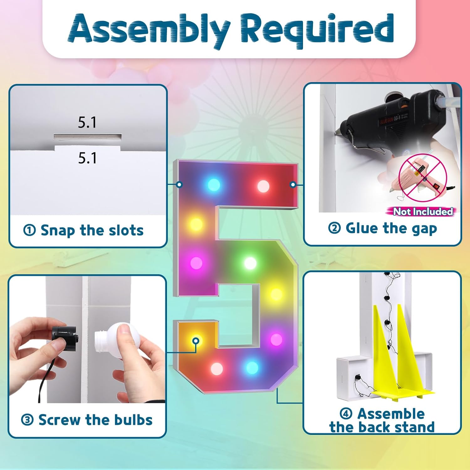 • Assembly Required. To assemble the light up numbers and letters, a hot glue gun is necessary. We have conveniently pre-cut the numbers into several pieces for your convenience. Simply consult the included instruction manual to easily assemble the impressive 4 ft tall and 3ft tall marquee numbers and letters using a hot glue gun.