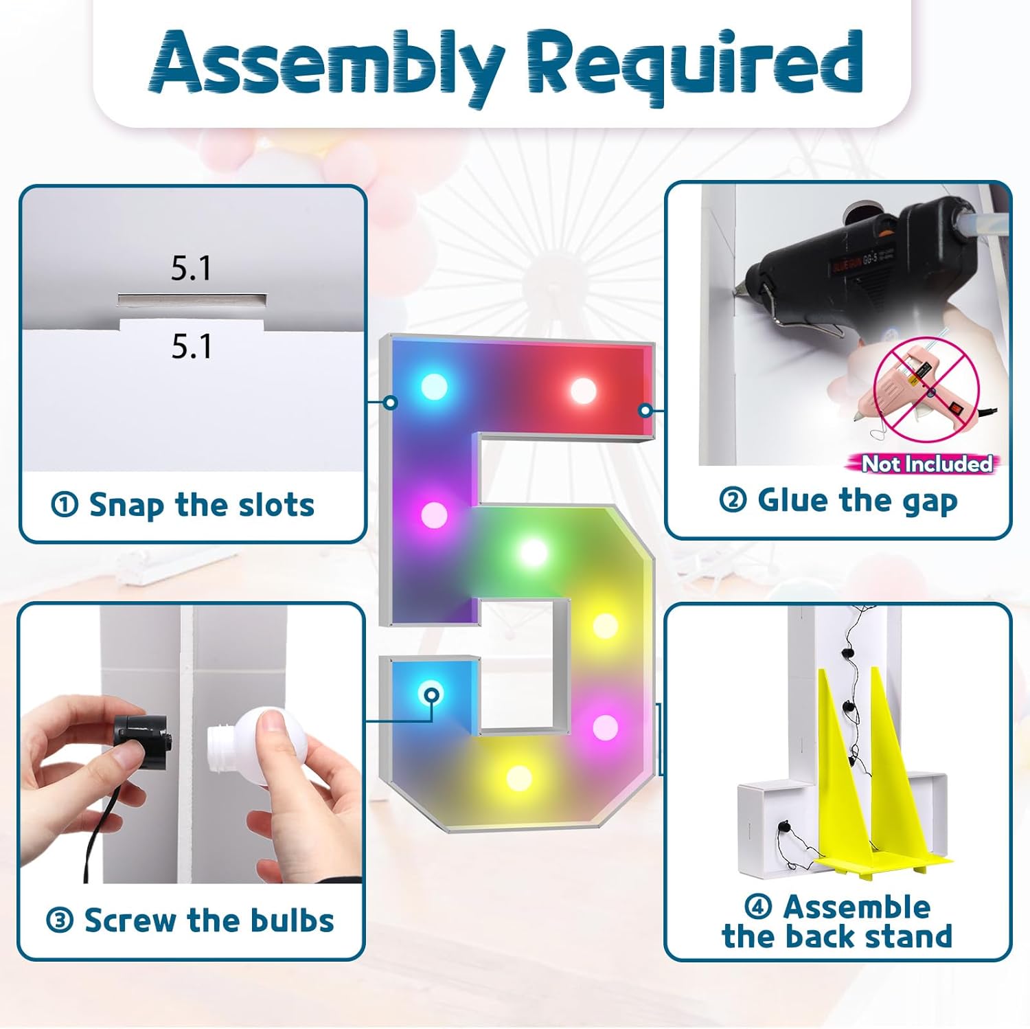 • Assembly Required. To assemble the light up numbers and letters, a hot glue gun is necessary. We have conveniently pre-cut the numbers into several pieces for your convenience. Simply consult the included instruction manual to easily assemble the impressive 4 ft tall and 3ft tall marquee numbers and letters using a hot glue gun.