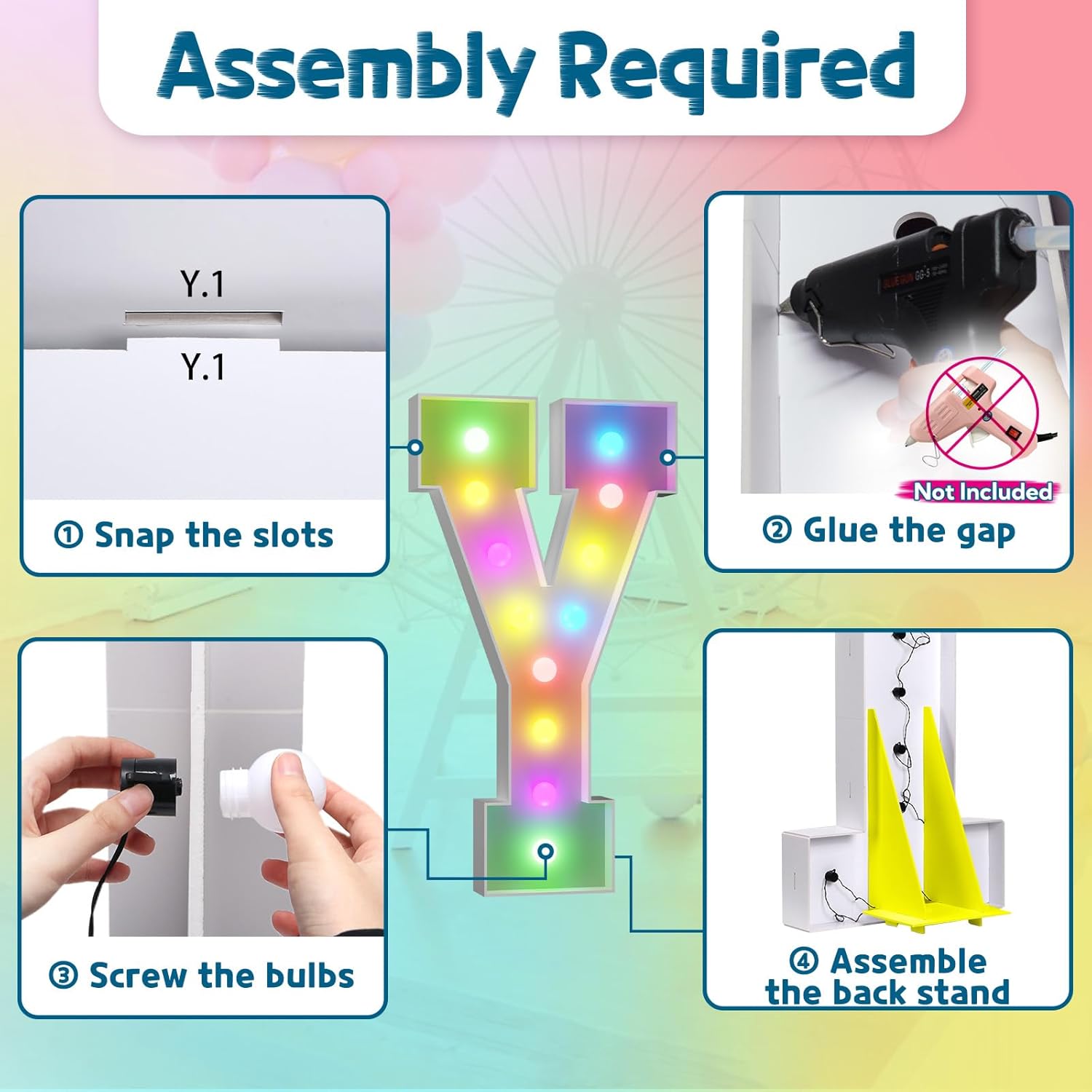• Assembly Required. To assemble the light up numbers and letters, a hot glue gun is necessary. We have conveniently pre-cut the numbers into several pieces for your convenience. Simply consult the included instruction manual to easily assemble the impressive 4 ft tall and 3ft tall marquee numbers and letters using a hot glue gun.
