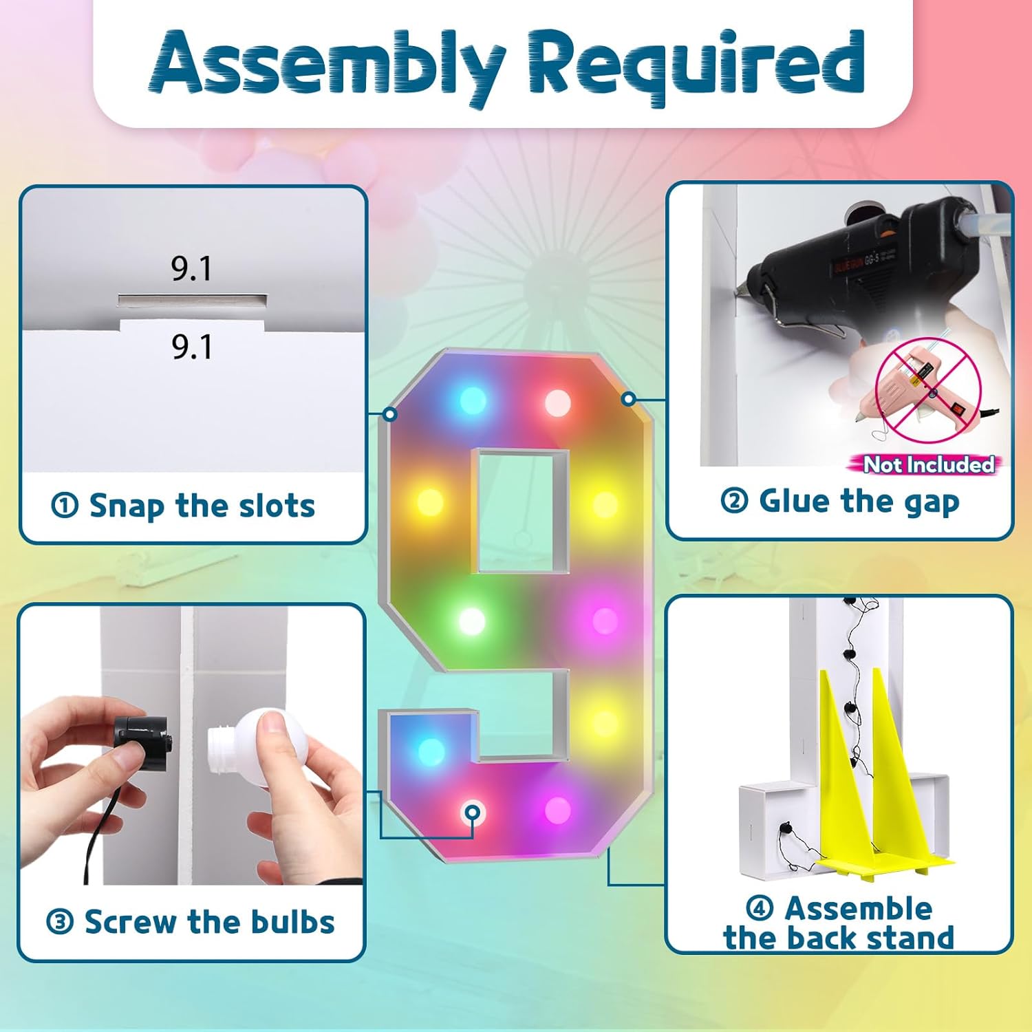 • Assembly Required. To assemble the light up numbers and letters, a hot glue gun is necessary. We have conveniently pre-cut the numbers into several pieces for your convenience. Simply consult the included instruction manual to easily assemble the impressive 4 ft tall and 3ft tall marquee numbers and letters using a hot glue gun.