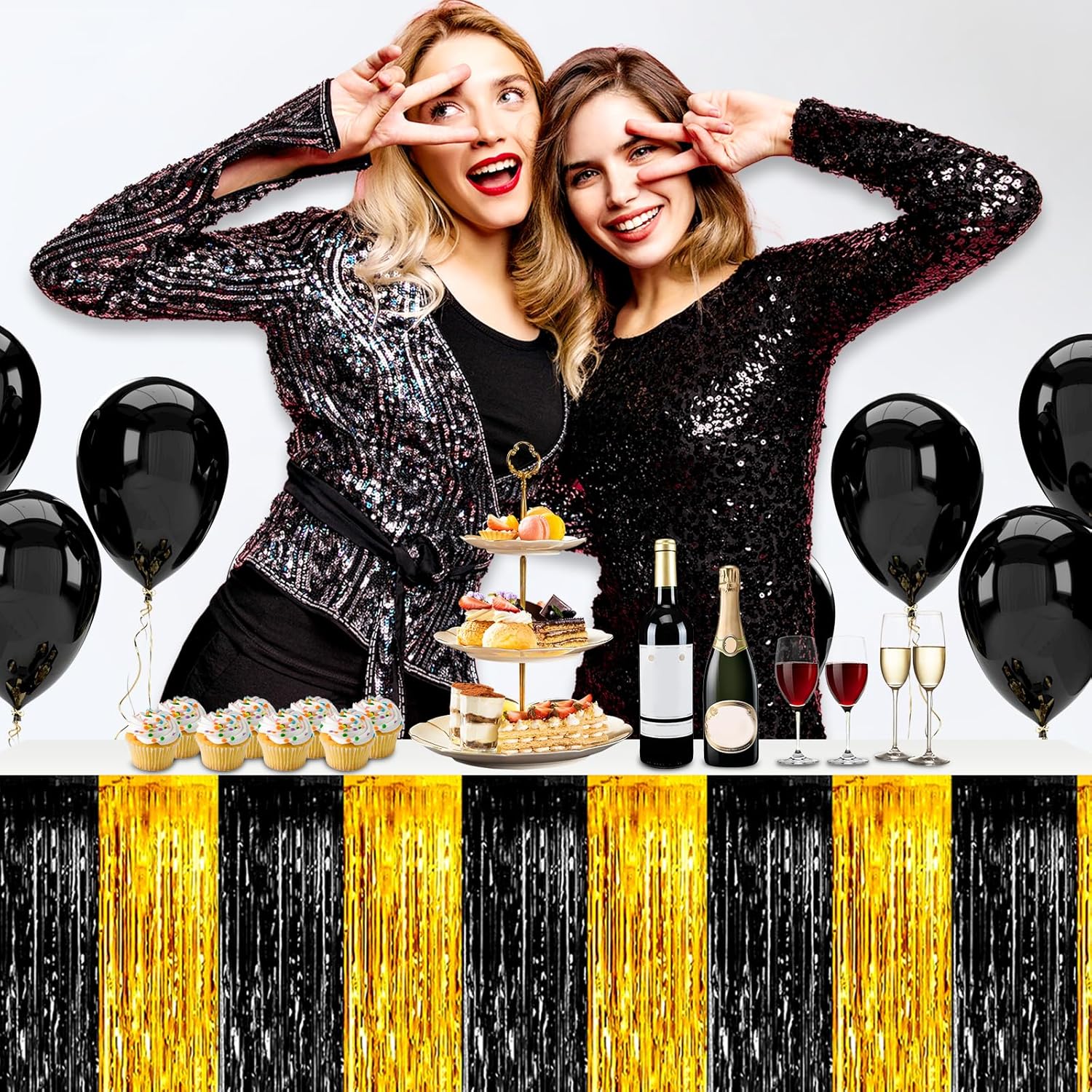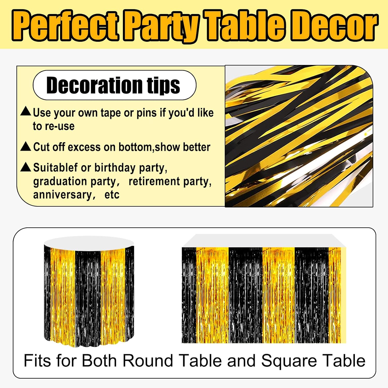 3 Pack 29x108 Inch Black Gold Foil Fringe Table Skirts Metallic Banner for Tinsel Streamer Garland Backdrop for Parade Floats Wedding Thanksgiving Birthday Christmas Halloween Party Decoration