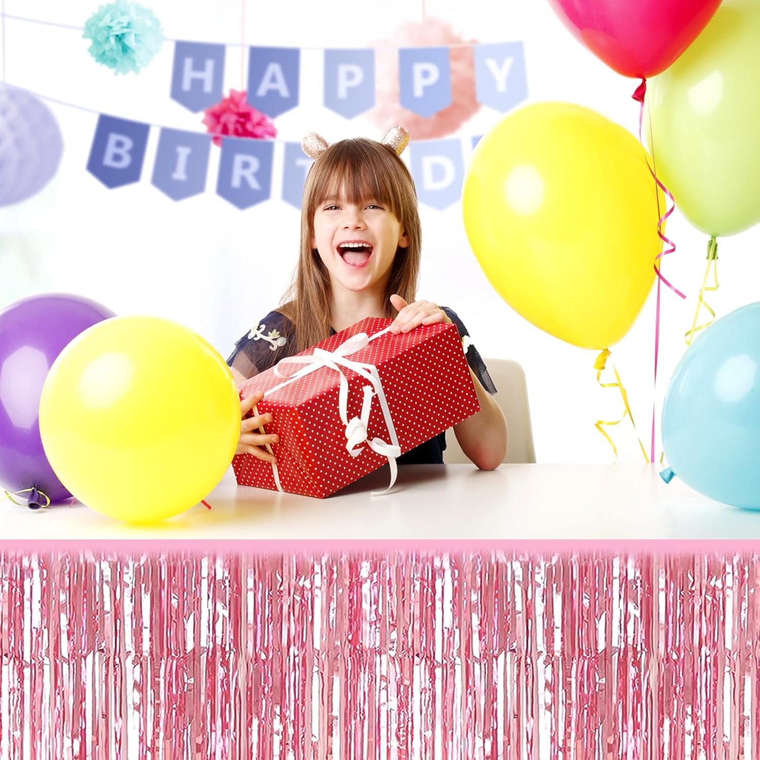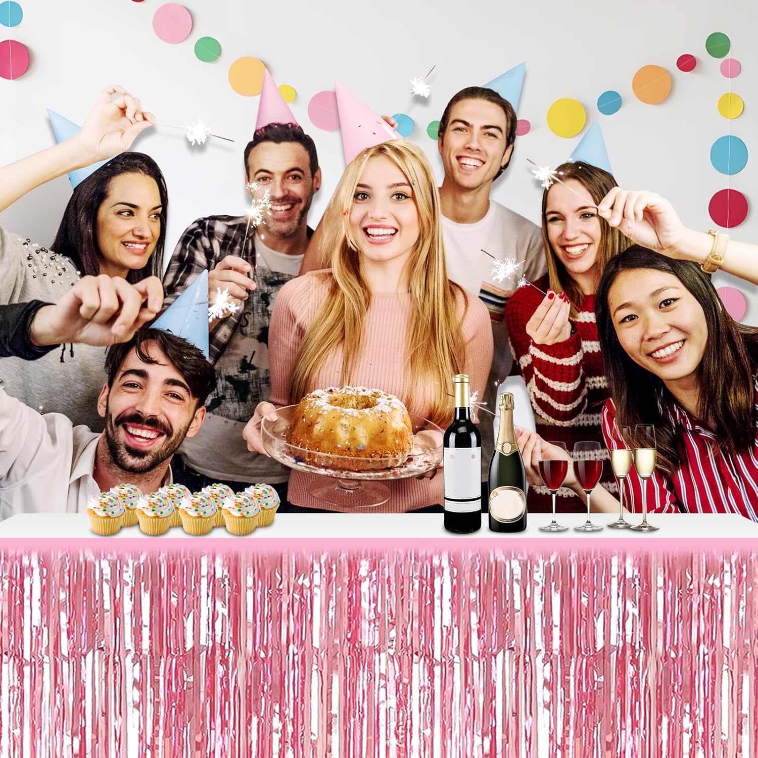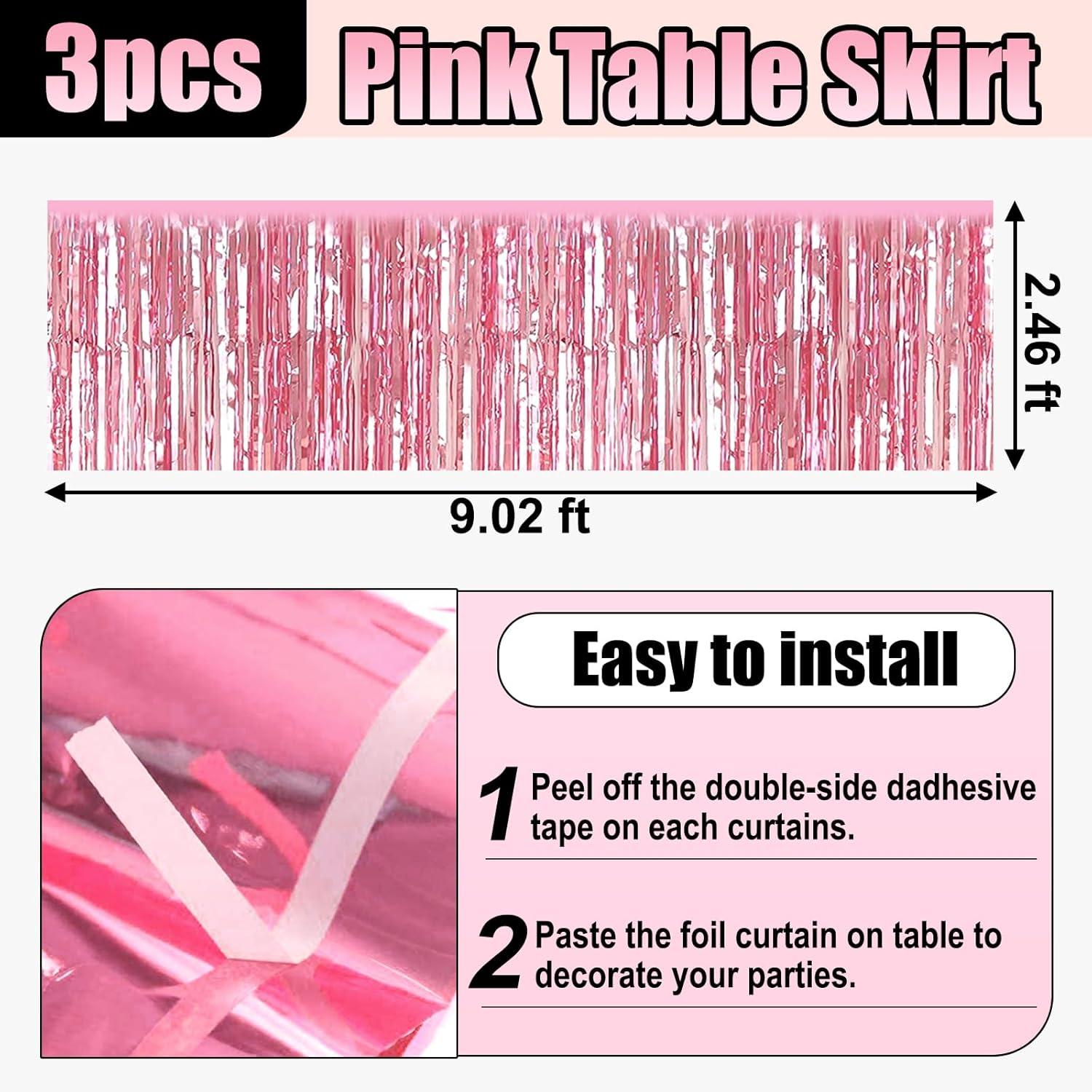 3 Pack 29x108 Inch Pink Foil Fringe Table Skirts Metallic Banner for Tinsel Streamer Garland Backdrop for Parade Floats Wedding Thanksgiving Birthday Christmas Halloween Party Decoration