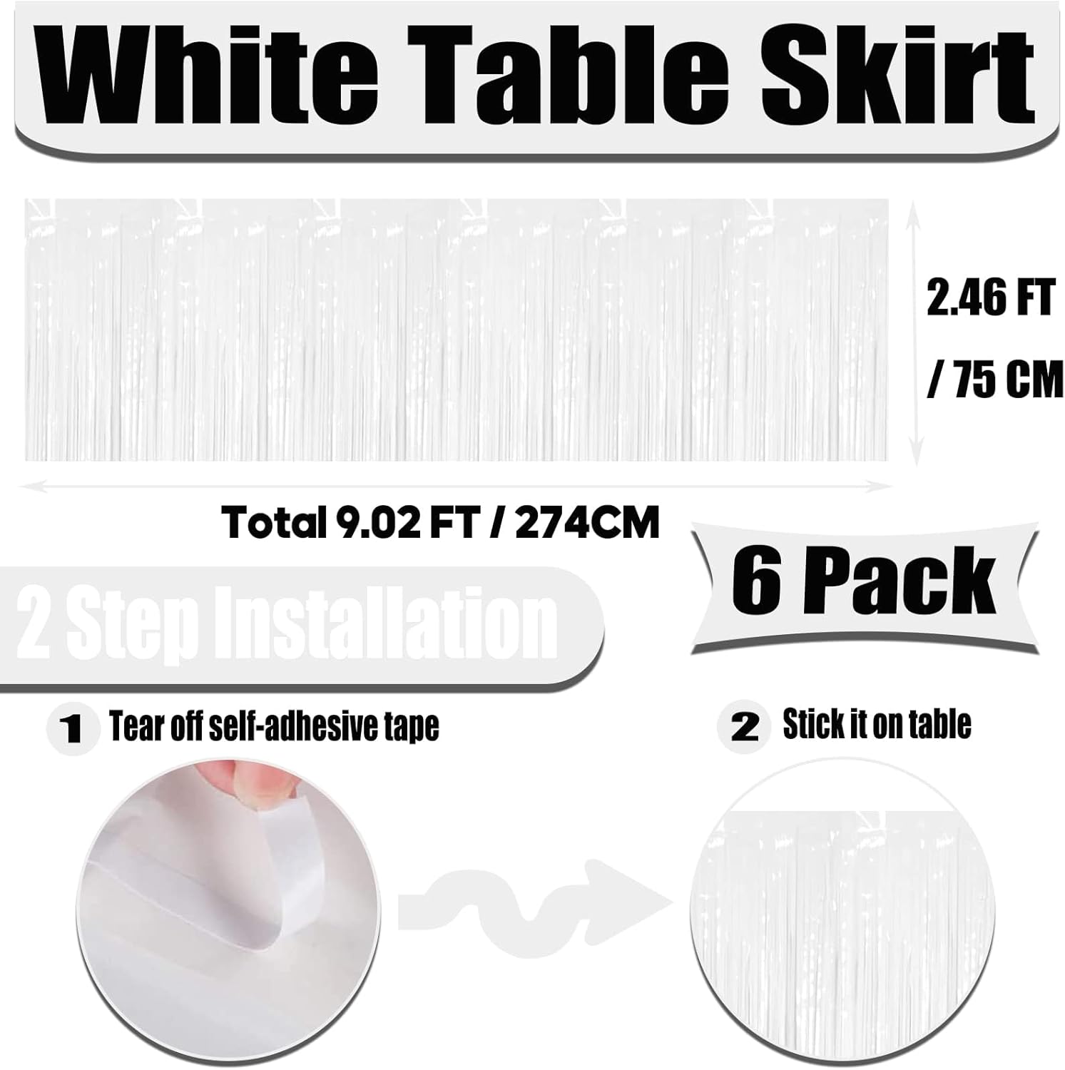 6 Pack 29x108 Inch Metallic Foil Fringe Tinsel Table Skirts Banner for Rectangle Tables Streamer Garland Curtains Backdrop for Wedding, Birthday, Parade Floats Party Decoration(White)