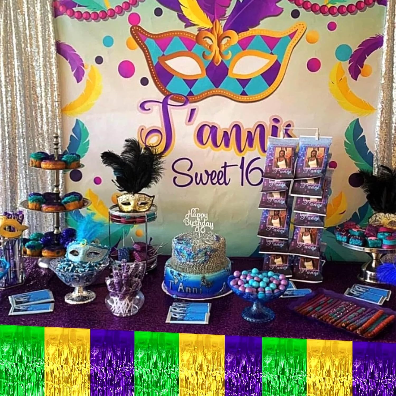 6 Pack 29x108 Inch Mardi Gras Metallic Foil Fringe Tinsel Table Skirts for Rectangle Tables Streamer Backdrop for Wedding, Birthday, Parade Floats, Carnival Party Decoration Gold Green Purple