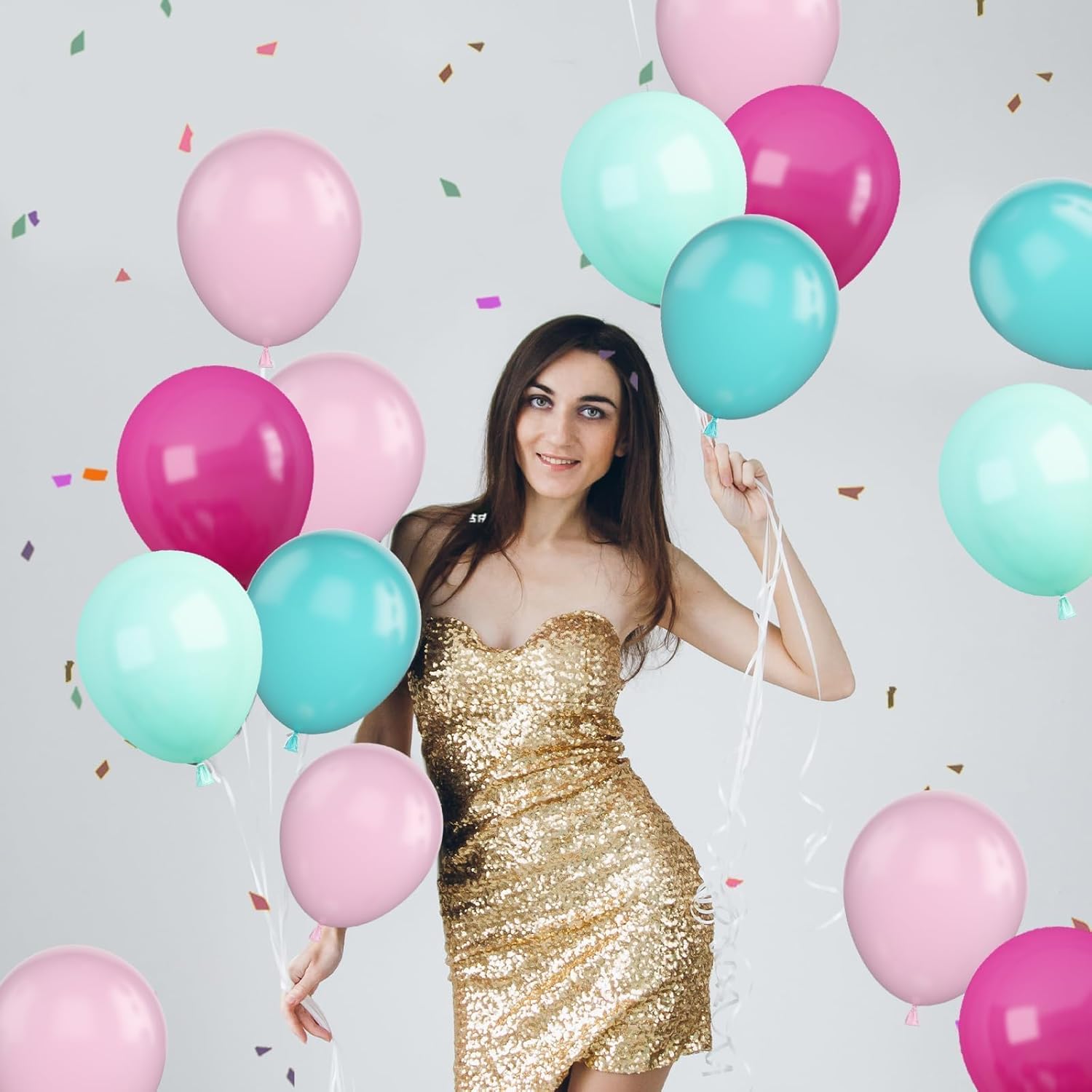 • Package Included : Our hot pink and teal blue birthday balloons set includes 60 pcs 12 inch latex balloons. 15 pcs hot pink balloons, 15 pcs pastel teal blue balloons, 15 pcs macaron pink balloons, 15 pcs teal blue balloons and 2 pcs hot pink ribbons