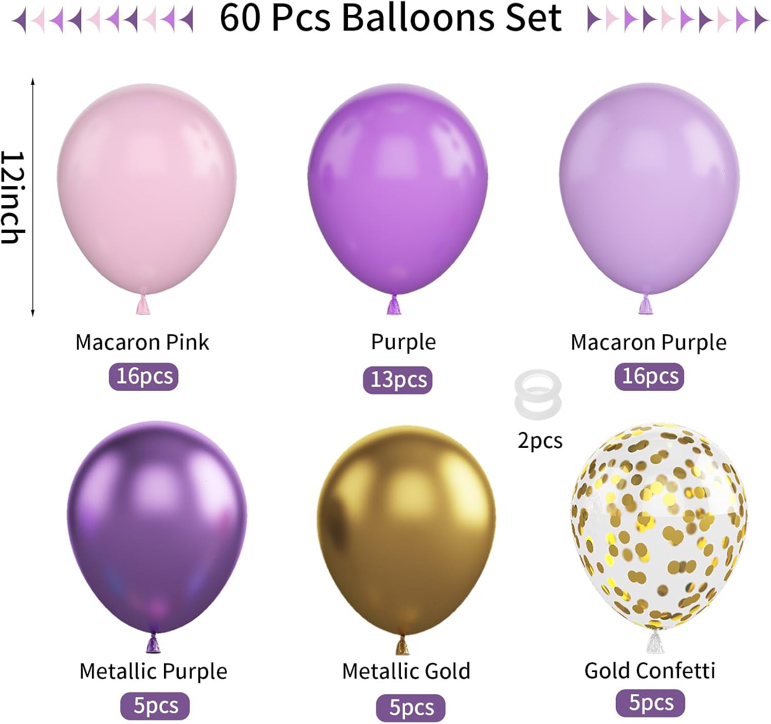• Included Components : 16 pcs pastel purple balloons, pink 13 5 metallic gold confetti 2 white ribbons