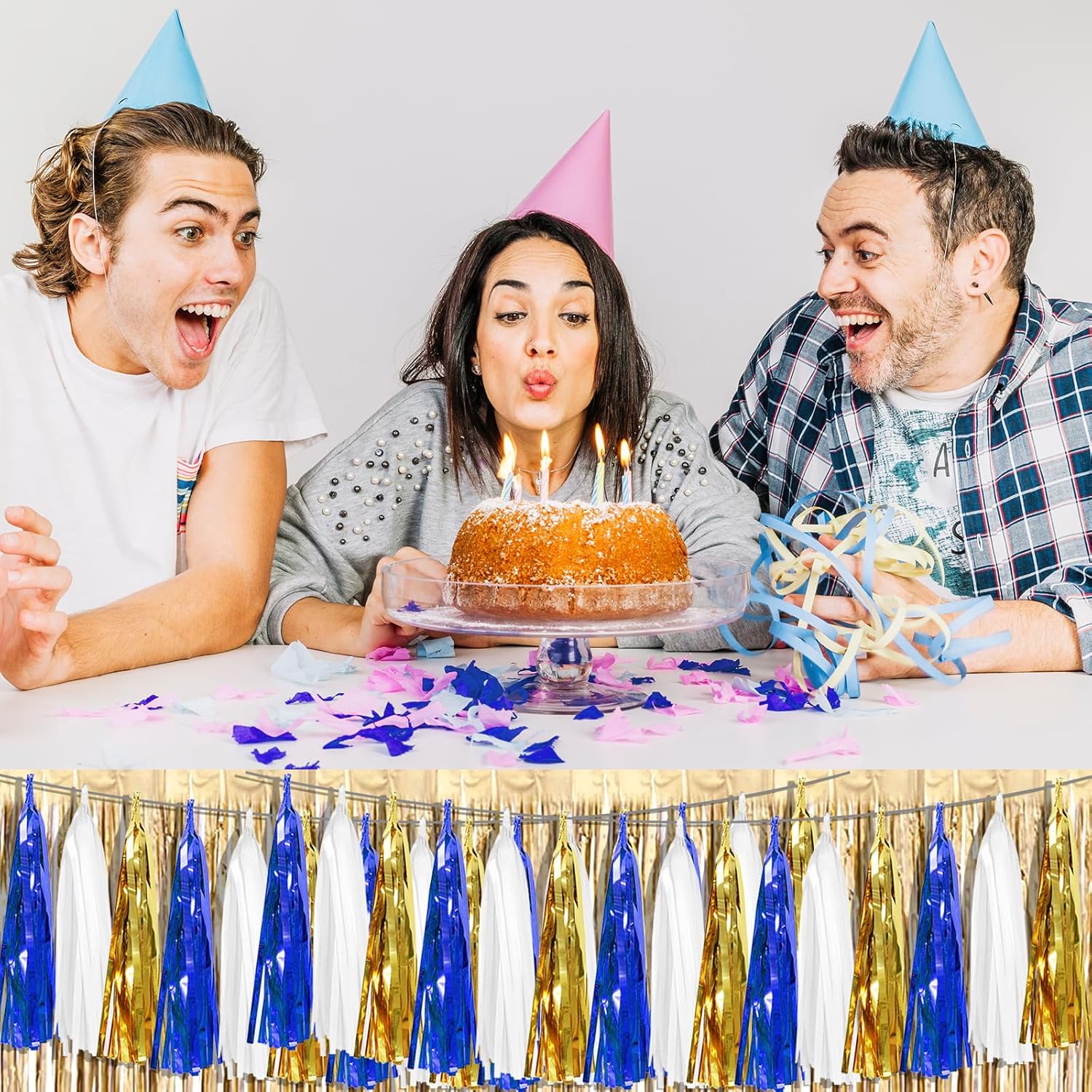 6P Navy-Blue White-Gold Foil Fringe Metallic Tassel-Garland, Tassels Banner Streamers for Parade Floats, Bachelorette, Wedding, Birthday, Graduation, Christmas, Bridal/Baby Shower Party Decorations