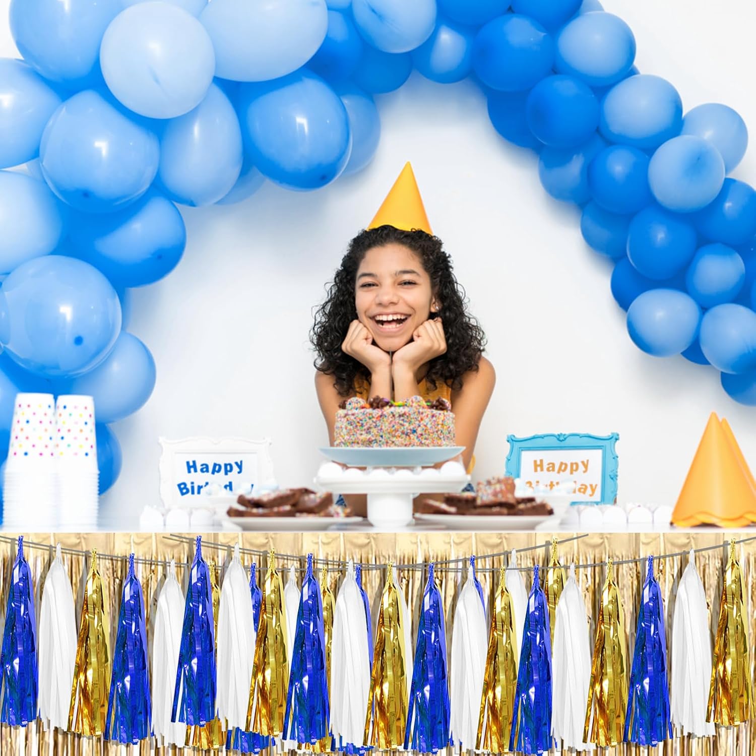 • 【Navy Blue White Gold Party Supplies Set】: The total length of the navy blue white gold birthday tassels banner is 59 feet, divided into 6 strips, each 9.8 feet long. Each banner contains 15 tassels, and each tassel measures 14 inches, for birthday decorations many occasions, and so on