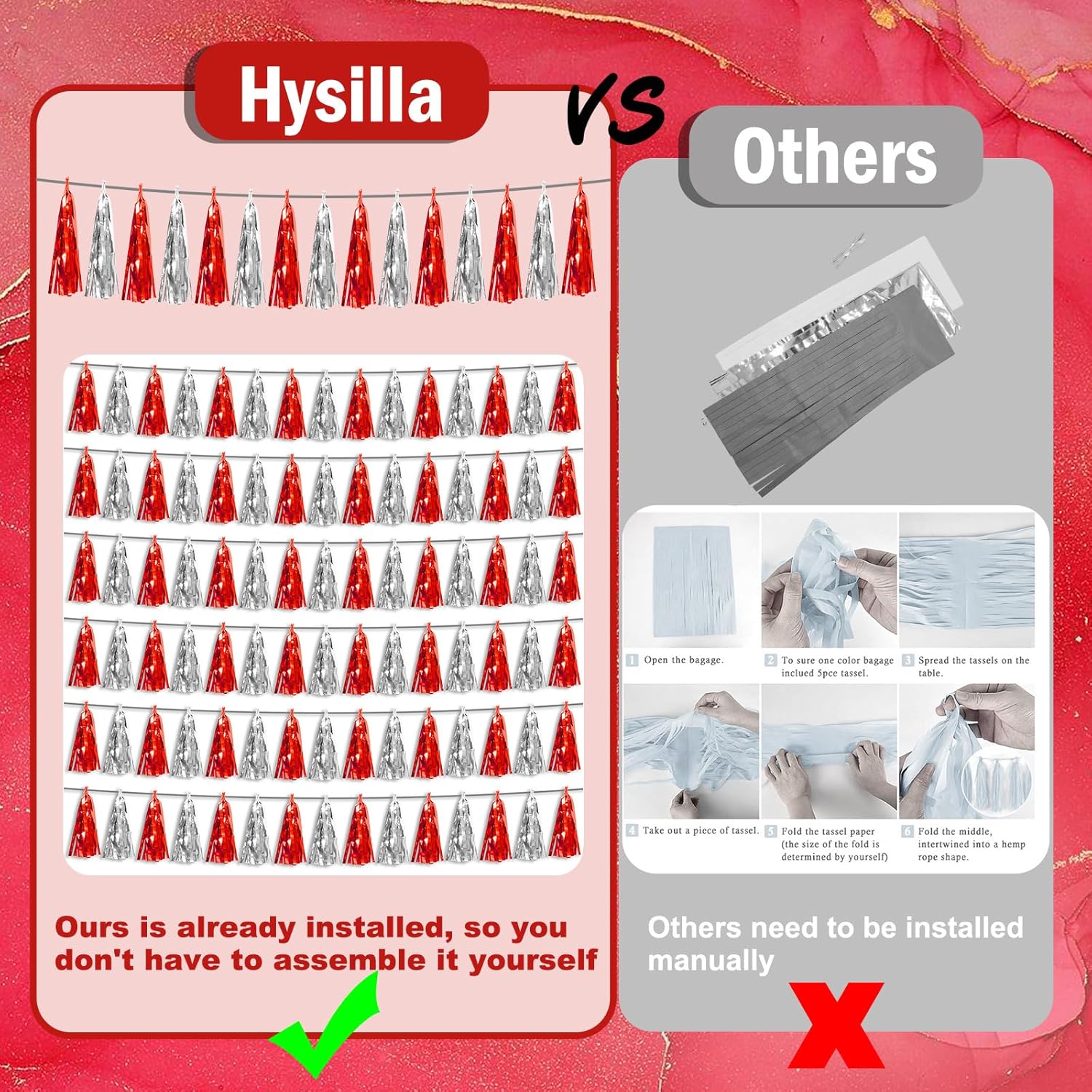• 【Red Silver Party Supplies Set】: The total length of the Red Silver birthday tassels banner is 59 feet, divided into 6 strips, each 9.8 feet long. Each banner contains 15 tassels, and each tassel measures 14 inches, for birthday decorations many occasions, and so on