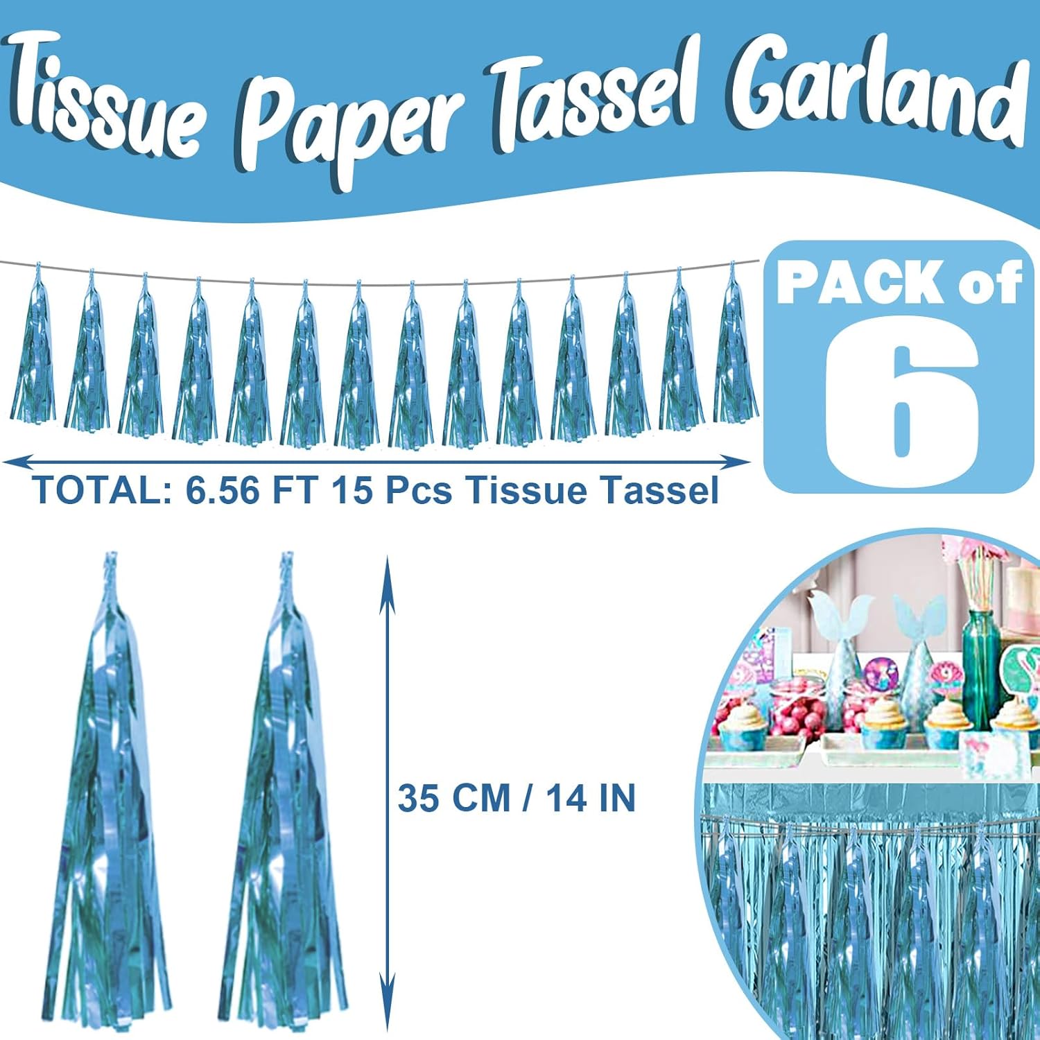• 【Light Blue Party Supplies Set】: The total length of the light blue birthday tassels banner is 59 feet, divided into 6 strips, each 9.8 feet long. Each banner contains 15 tassels, and each tassel measures 14 inches, for birthday decorations many occasions, and so on