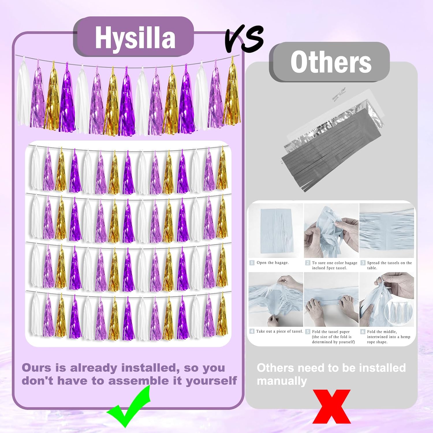• 【White Light Purple Purple Gold Party Supplies Set】: The total length of the white light purple purple gold birthday tassels banner is 59 feet, divided into 6 strips, each 9.8 feet long. Each banner contains 15 tassels, and each tassel measures 14 inches, for birthday decorations many occasions, and so on