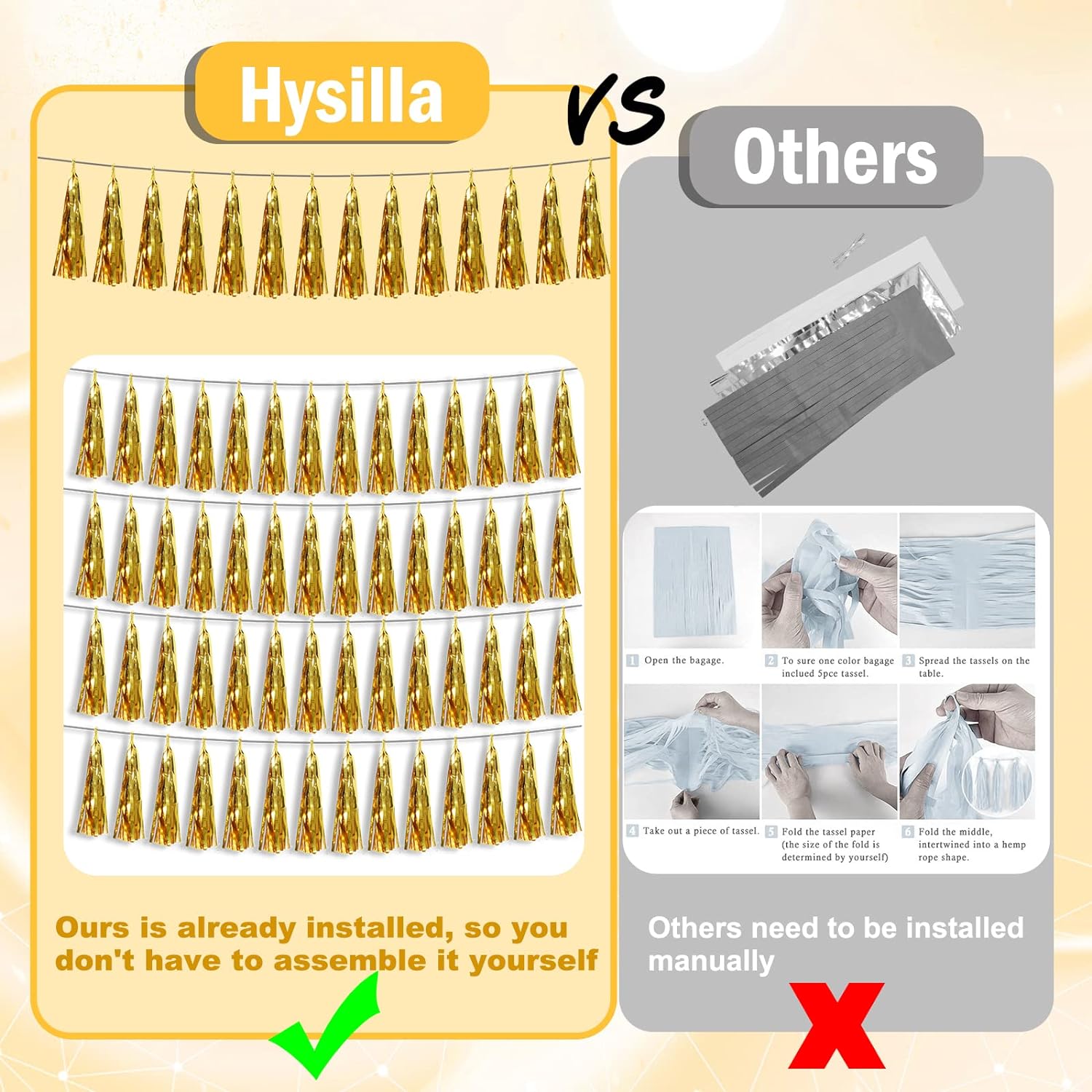 • 【Applicable Occasions】you can use the gold tinsel fringe garlands to decorate a classroom, the stage for a school program, a homecoming float, a wedding decoration, a birthday party, a baby shower, Halloween, Christmas, new year's Eve, a housewarming party, a bachelorette party, an anniversary Memorial, Hollywood Party, Independence Day, Carnival Party, Bridal Shower, Graduation and more.