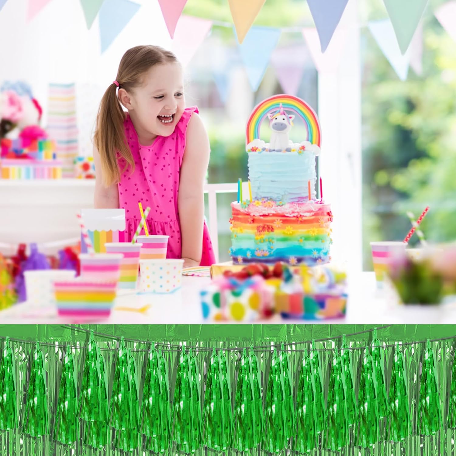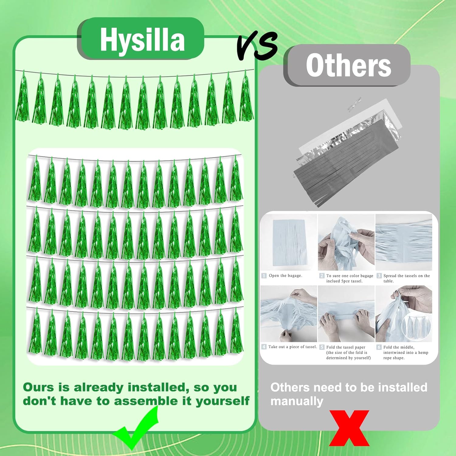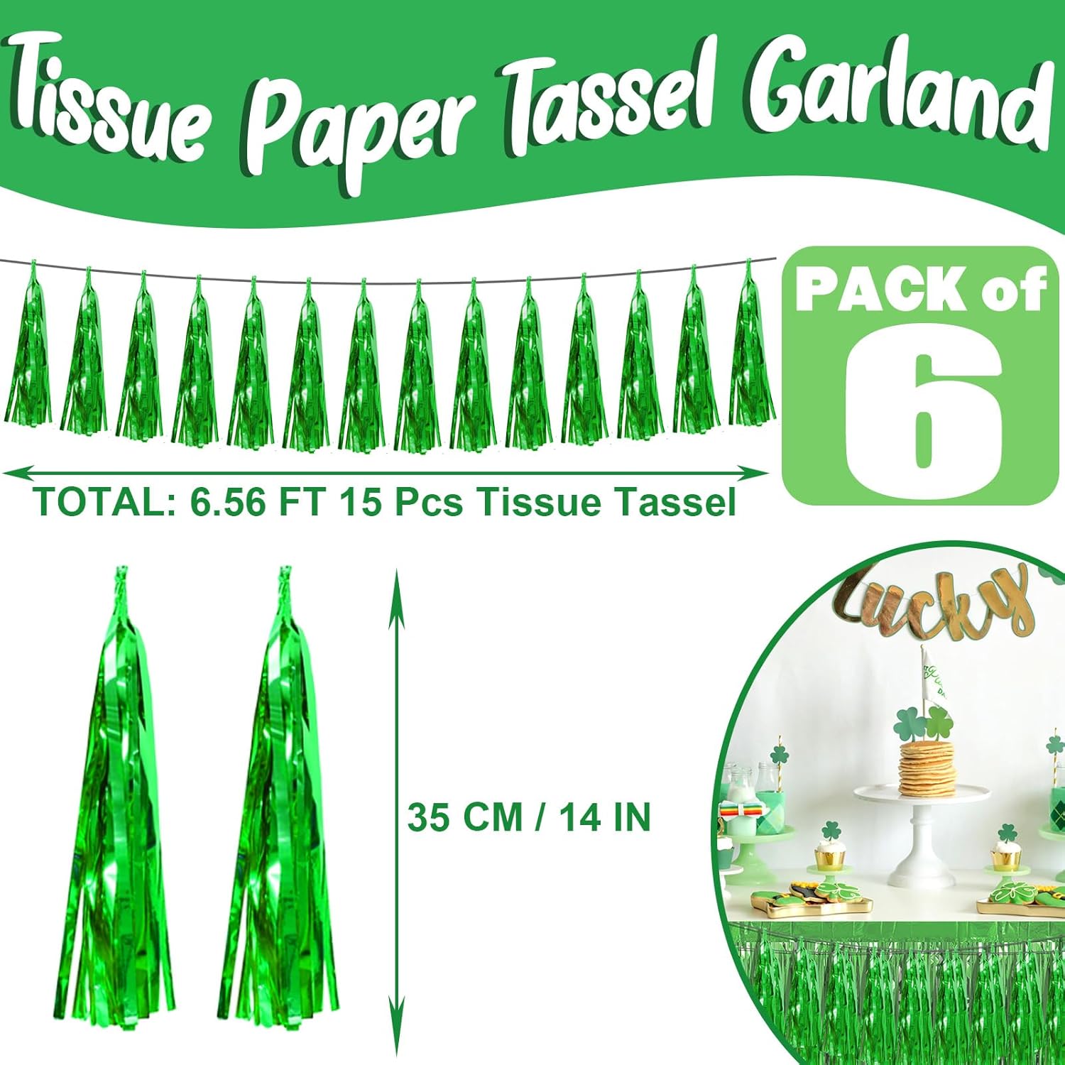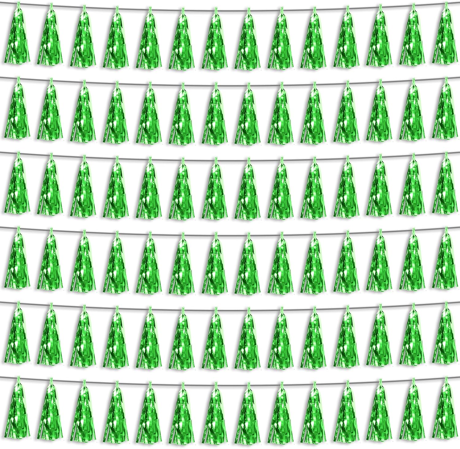 • 【Green Party Supplies Set】: The total length of the green birthday tassels banner is 59 feet, divided into 6 strips, each 9.8 feet long. Each banner contains 15 tassels, and each tassel measures 14 inches, for birthday decorations many occasions, and so on