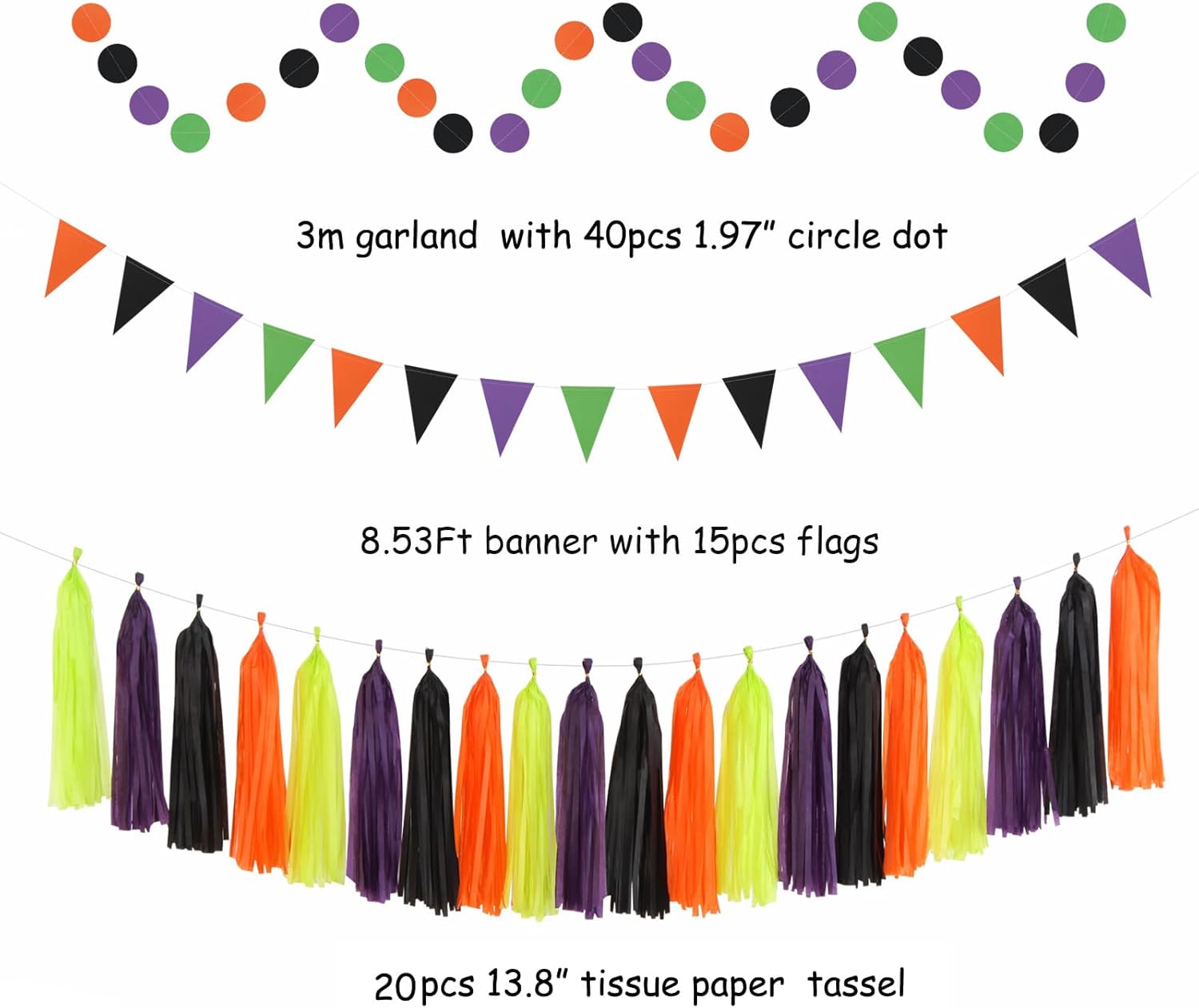 Orange Black Purple Green Party-Decorations - 33Pcs Banner,Halloween Streamers Tassel Garland,Tissue Pom Poms Honeycomb,Paper Lantern Fan,Birthday Wedding Baby Bridal Shower Decor Supplies Hugtmr