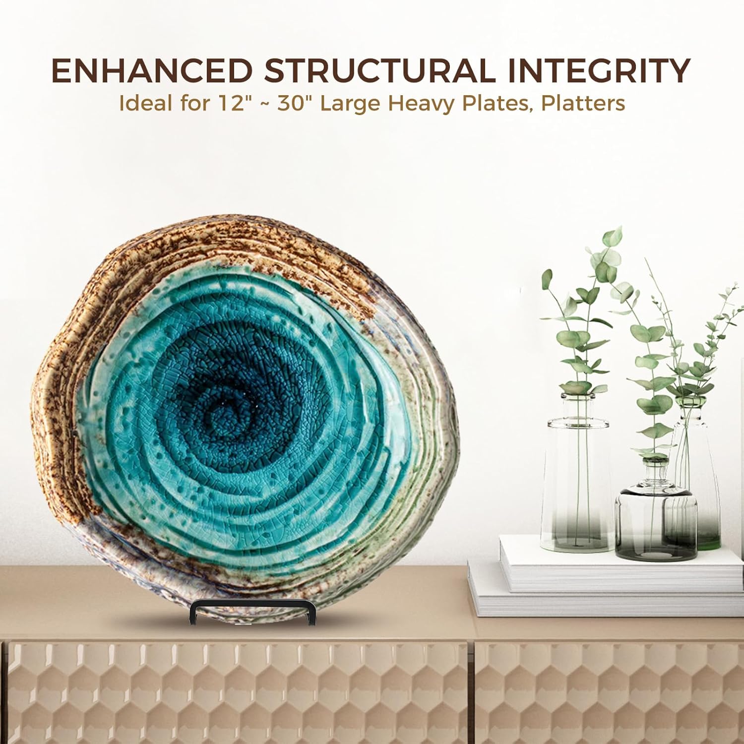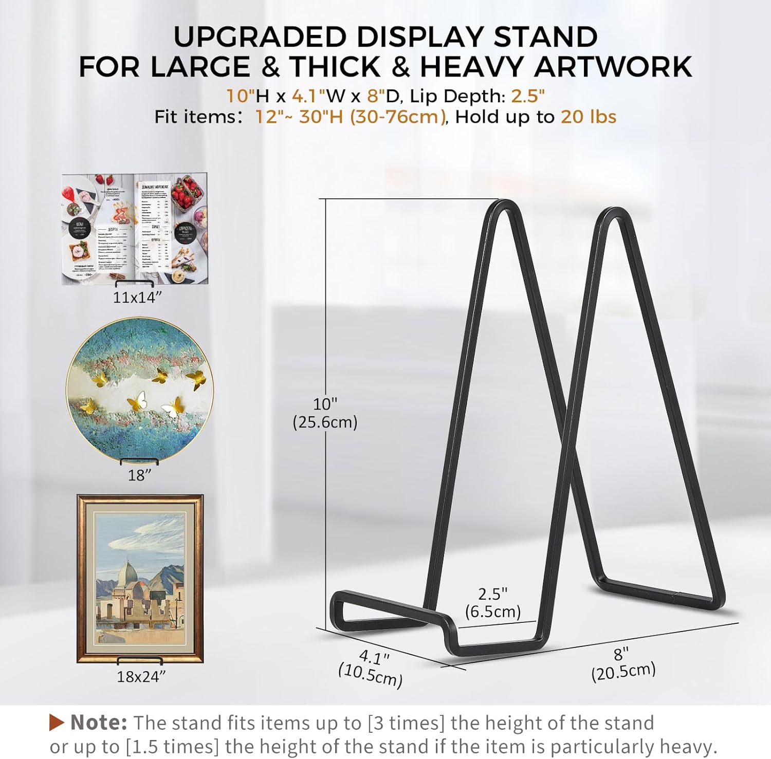 • Design for Oversized Items - This 10 inch plate stand features a upgraded 4" widened base and a sturdy 2.5" deep lip, and use 5.5 thickened wire diameter as a strong support, which can holds up to 20 lbs. Perfect for holding super large objects ranging from 10" to 30" in size, such as heavy and thick plates, frames, plaques, tiles and artworks.