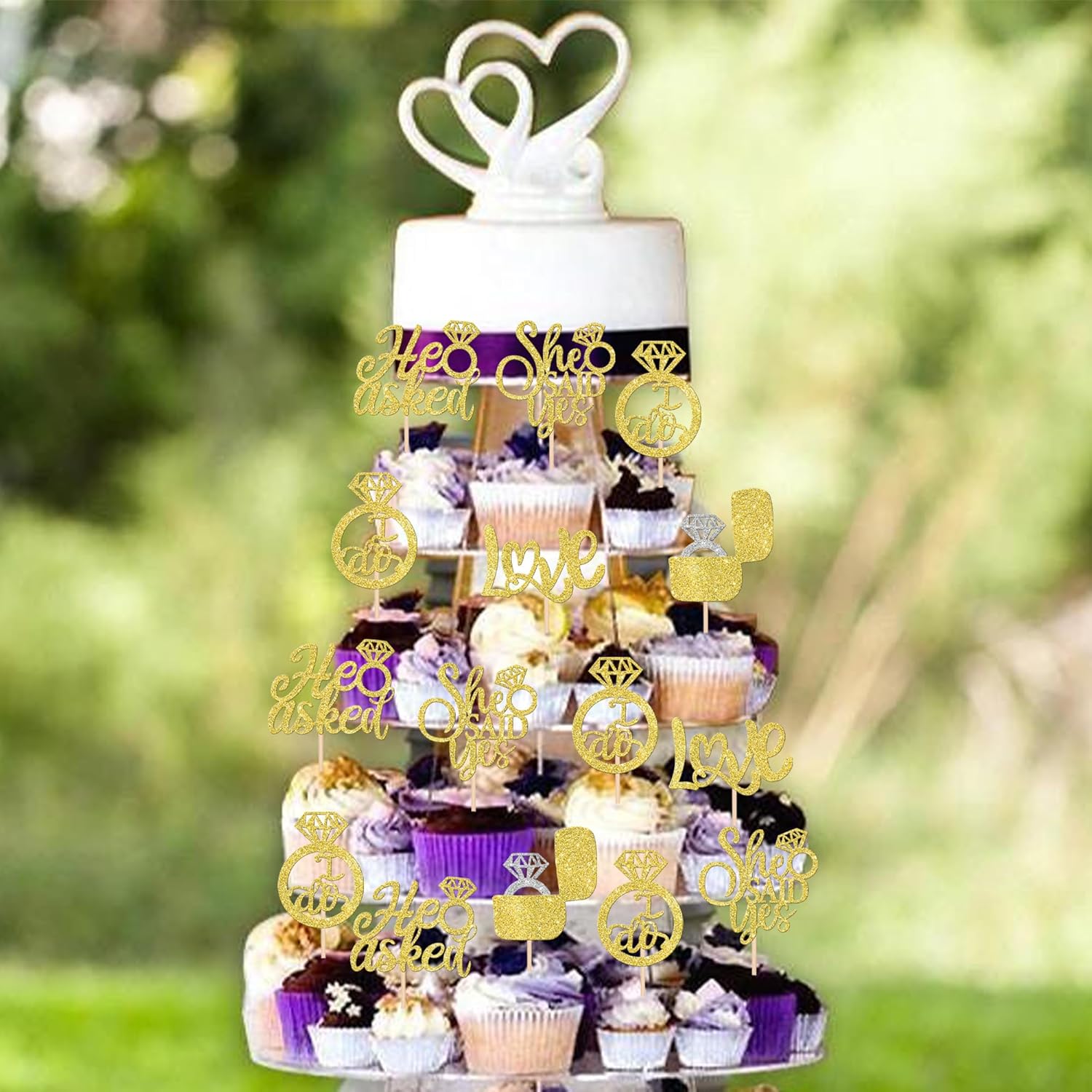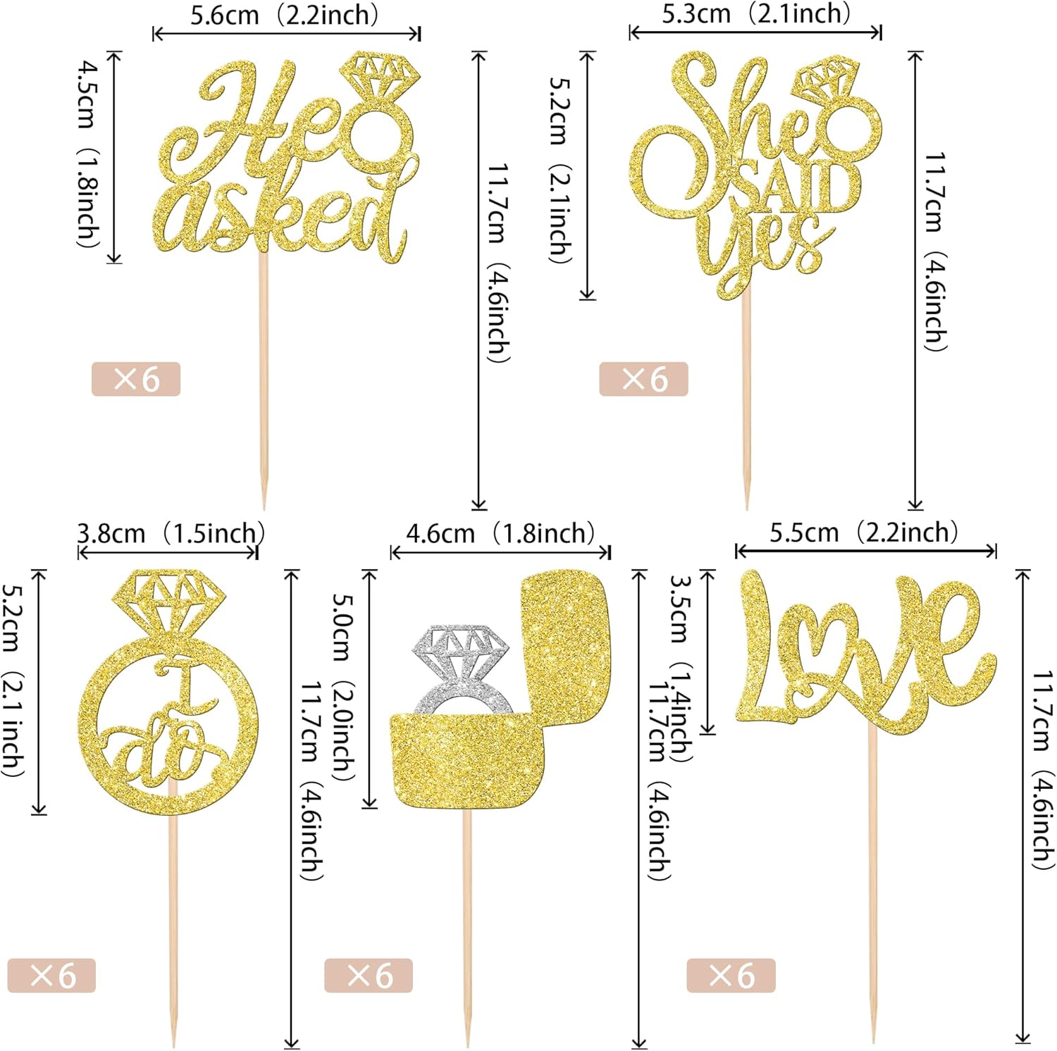 30 PCS He Asked She Said Yes Cupcake Toppers Love I Do Diamond Ring Cupcake Picks for Wedding Enaggement Bridal Shower Party Cake Decorations Supplies Gold