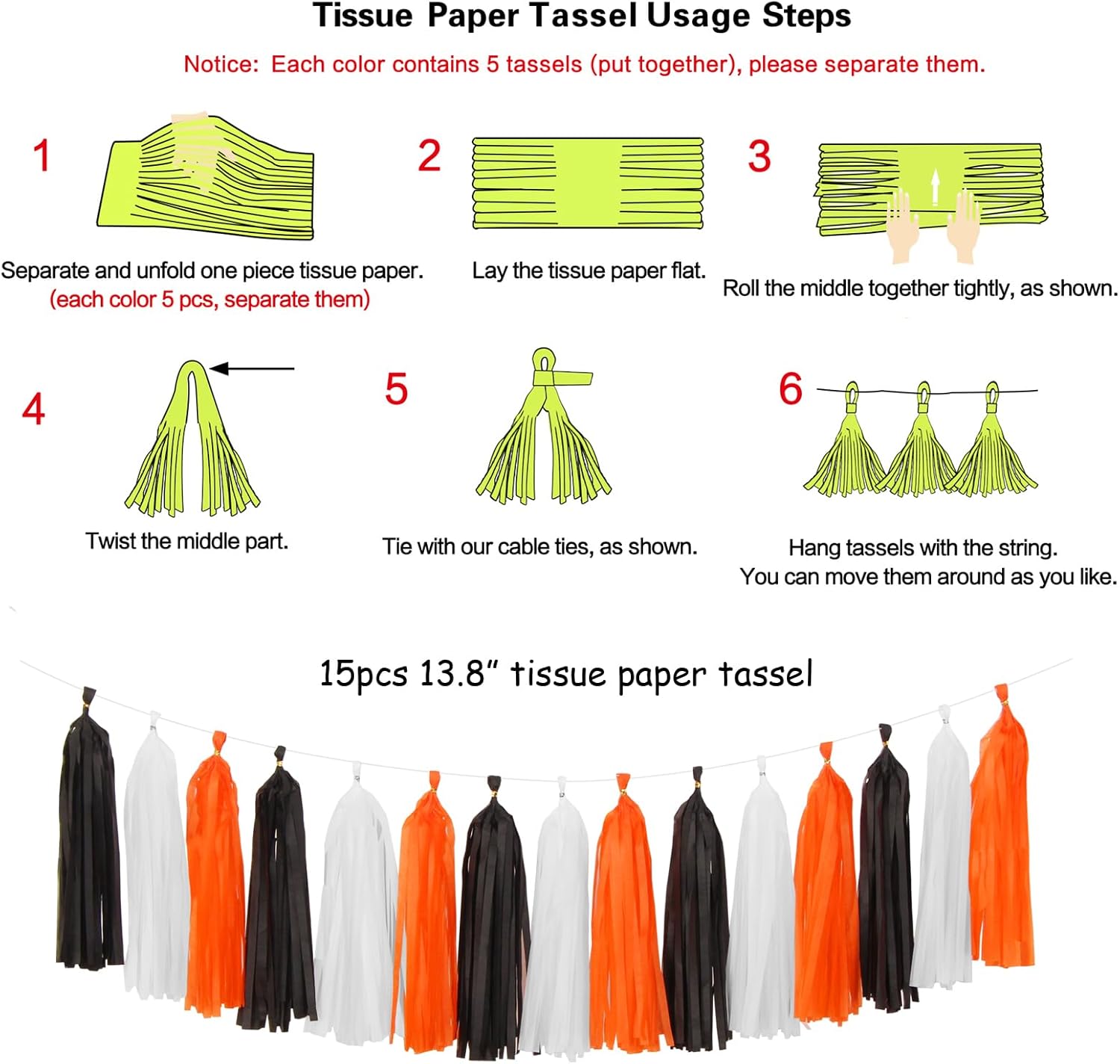 • 【Garland includes】15tassels,5pcs white tassel garland, 5pcs orange tassel garlands, 5pcs black garlands. Each tassel is about 14" long after assembled. And each garland comes with a 10ft long free String for hanging these tassels.