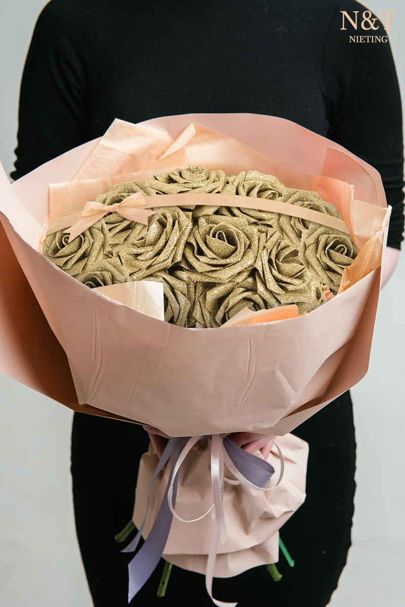 N&T NIETING Artificial Flowers Glowing Gold Flowers Foam 25pcs Glitter Roses Real Looking Fake Roses with Stem for DIY Wedding Bouquets Centerpieces Bridal Shower Party Home Decorations