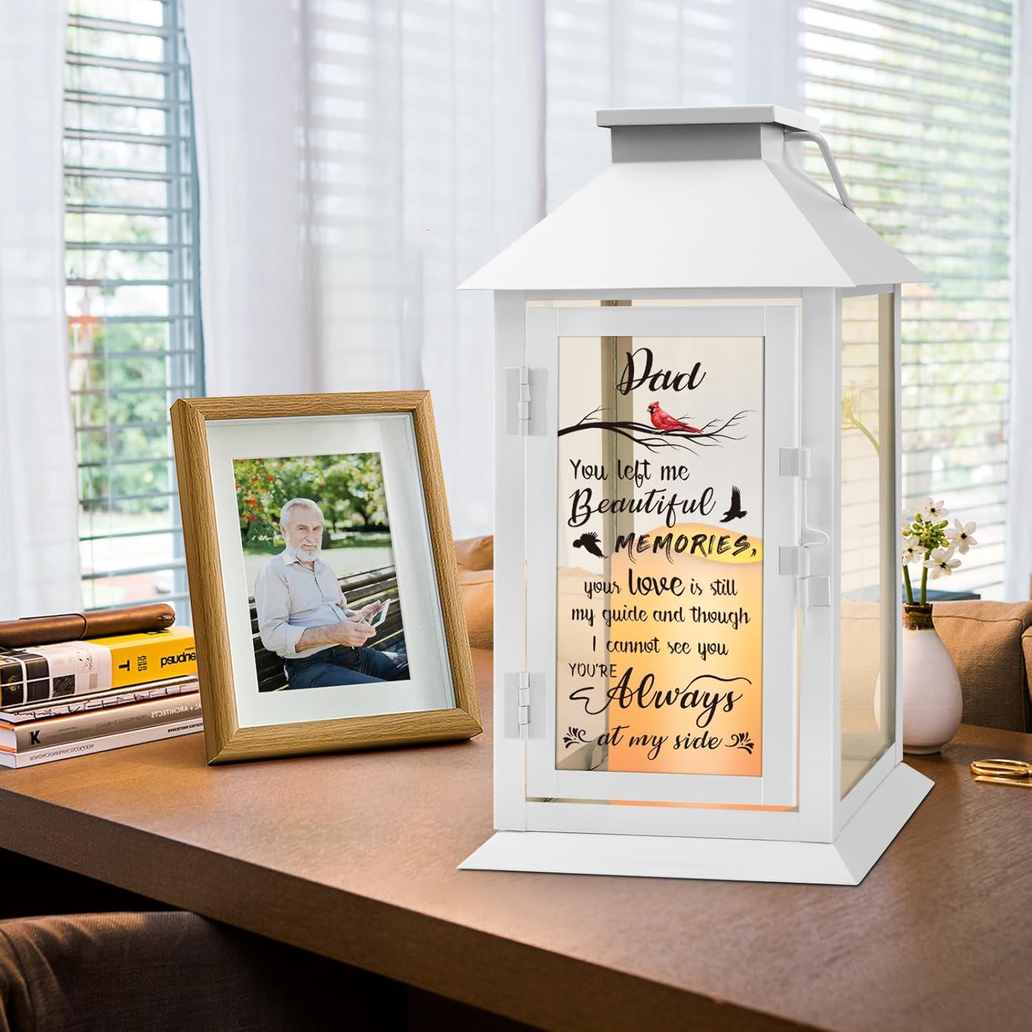 • Sympathy Gifts for Loss of Dad: Memorial lanterns are custom memorial gifts for loss father that offer hope, comfort and help to a grieving friend or family member. Flickering flameless candle lights surround us like those we love never leave. Longer lasting than other gifts like flowers, place sympathy lanterns around home to remind you of happy memories. The cardinal pattern on the glass makes us feel that our loved ones are close by. Father's love is eternal and will always be by your side.