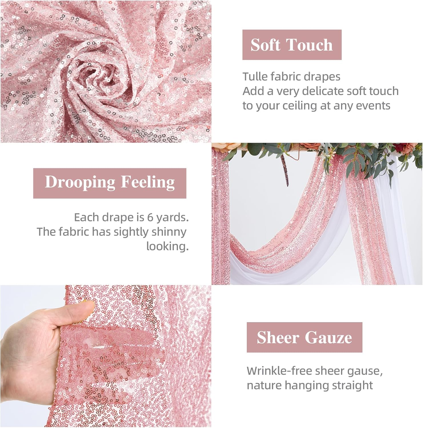 • 【Best Choice Wedding Arch】Package includes 2 panels arch drapes.1 panel white sheer arch drapes size is 28 inches wide and 228 inches long, another rose gold sequin drapes size is 16 inches wide and 228 inches long. The length is long enough to fit any size arch decoration. Soft and overhanging pendants make the wedding decorations more popular.This sheer drapery backdrop can help your party to create a warm and elegant scenes.