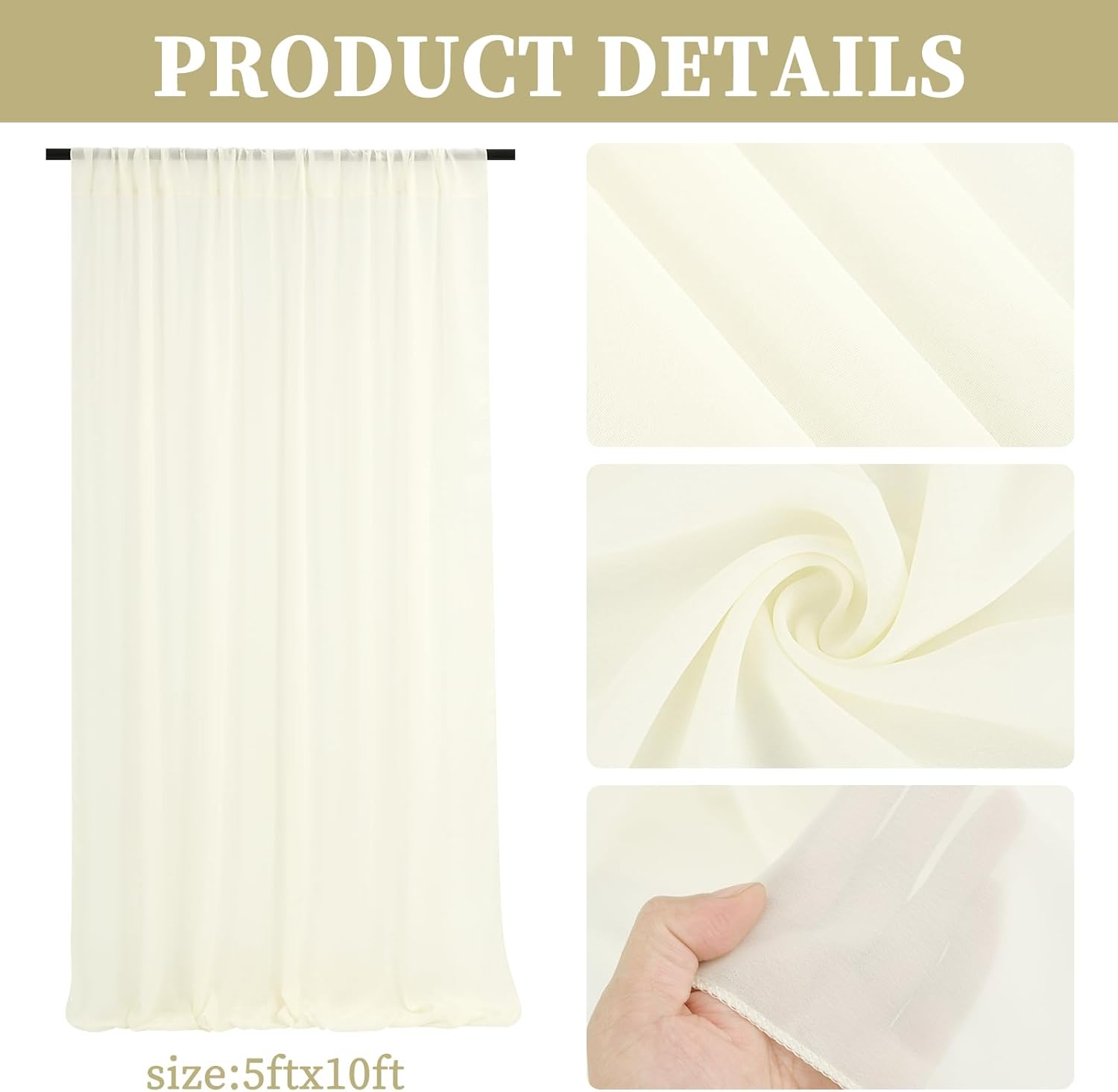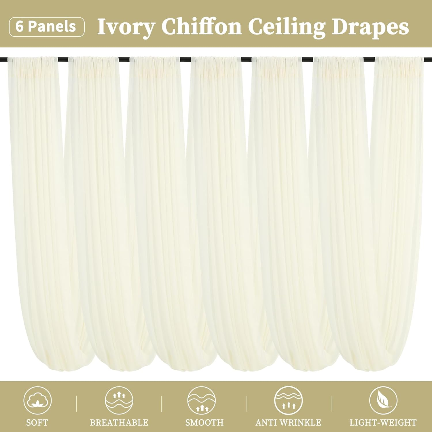• 🍸【Chiffon Fabric Curtain】The package will include 6 panels ivory wedding drape curtain, each wedding extra long curtain measures 5 feet(60inch)wide x10 feet(120inch) long. Sufficient quantity can meet your needs. These backdrop curtains are applicable for any indoor and outdoor occasion either for decorative or functional uses.(Tips: There is no hook or circle in the package)