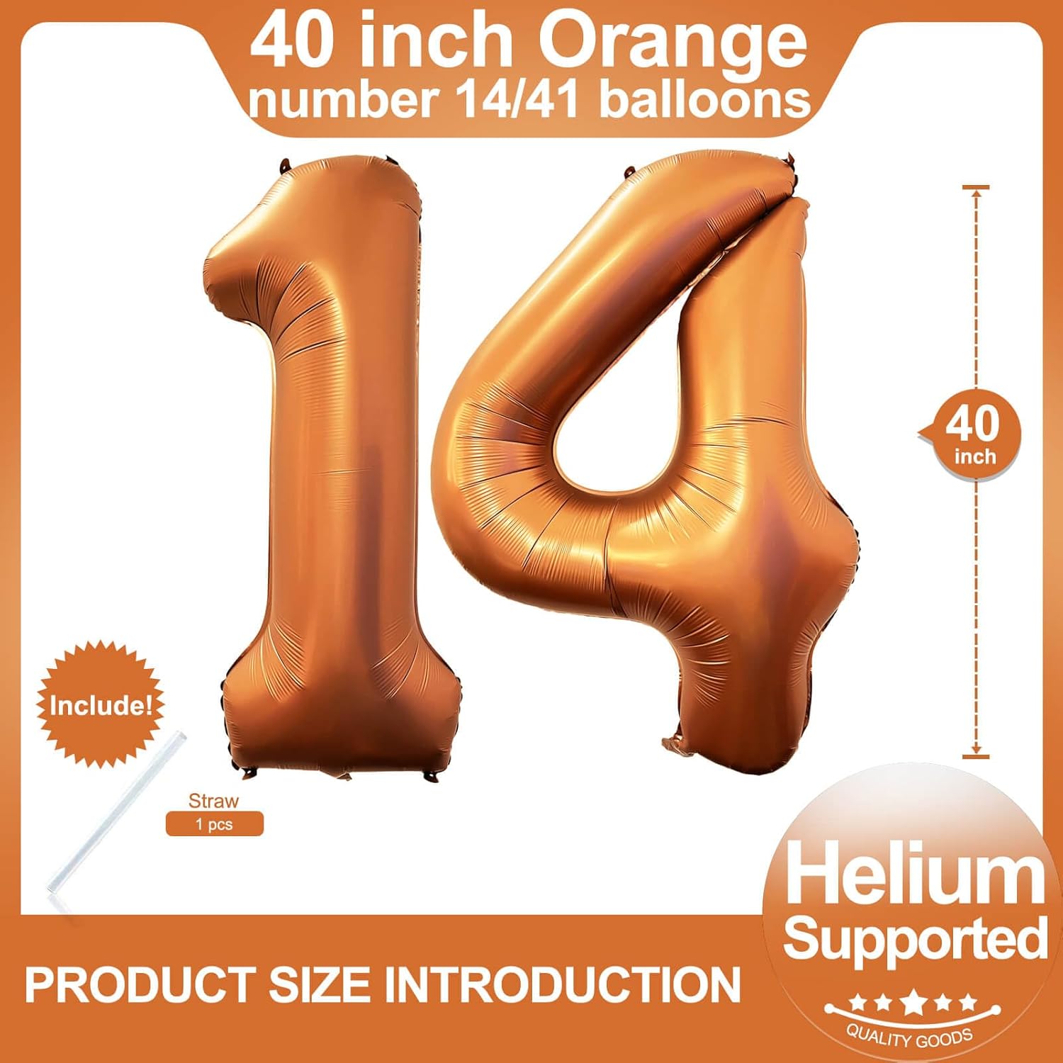 • Package Included:40 inch Orange numbers 1 and 4 (uninflated) + 1 Straw,Orange 14 or 41 number foil digital balloons are the best for 14th or 41st birthday party, wedding celebration, anniversary, ceremories celebration, business or big events party.