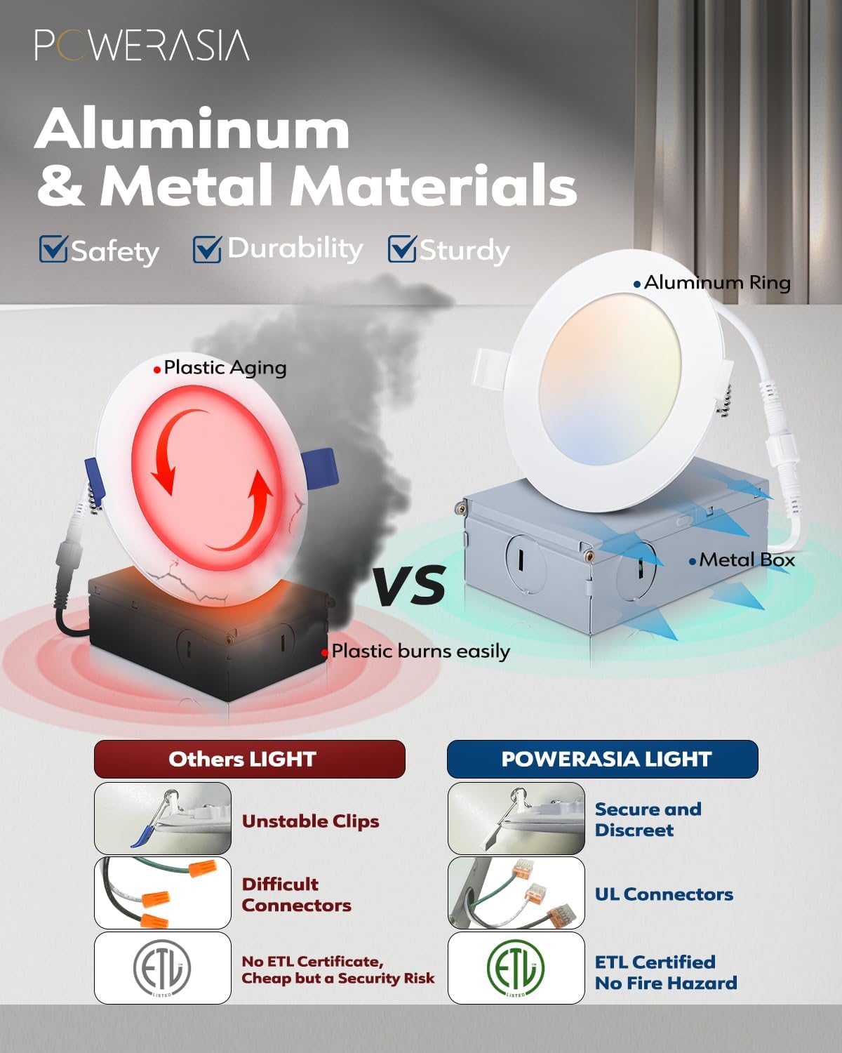 • 💡【High Brightness】 POWERASIA 90+CRI technology brings true color rendering to your house. The 4-inch slim lights use the new generation of LED chips with higher lumens and lower power. 850LM 9 Watts, which equals to 110W incandescent lamp, saving you up to 88% in energy costs.