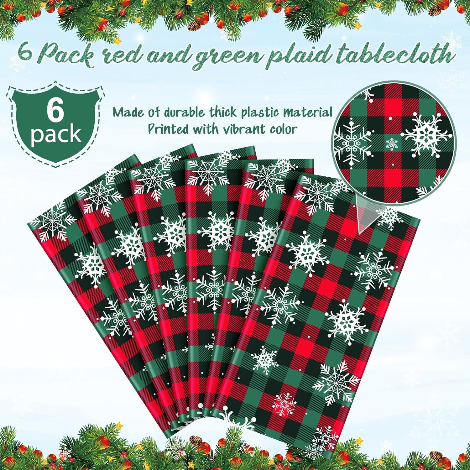 • What will you receive: 6 pieces plastic Christmas party tablecloth,all over printed with white snowflake patterns on red and green buffalo plaid background,ideal for decorating your winter holiday Christmas party supplies and decorations